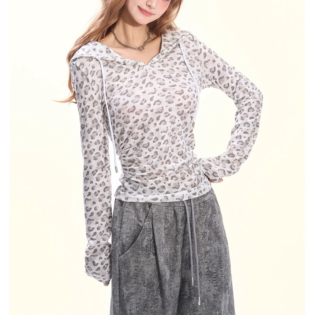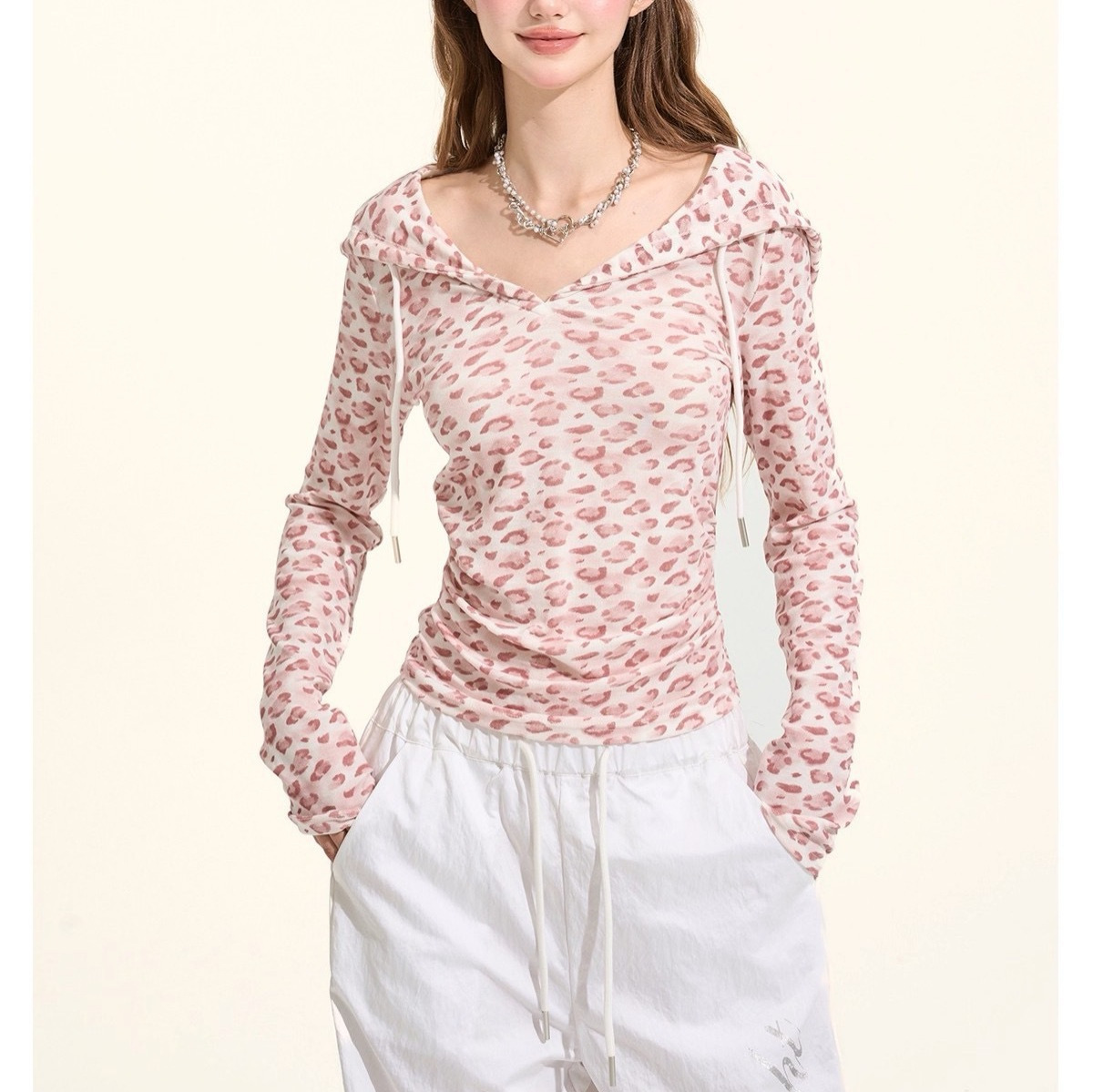 早秋小众独特野生甜妹*莱赛尔针织褶皱收腰豹纹上衣长袖连帽t恤