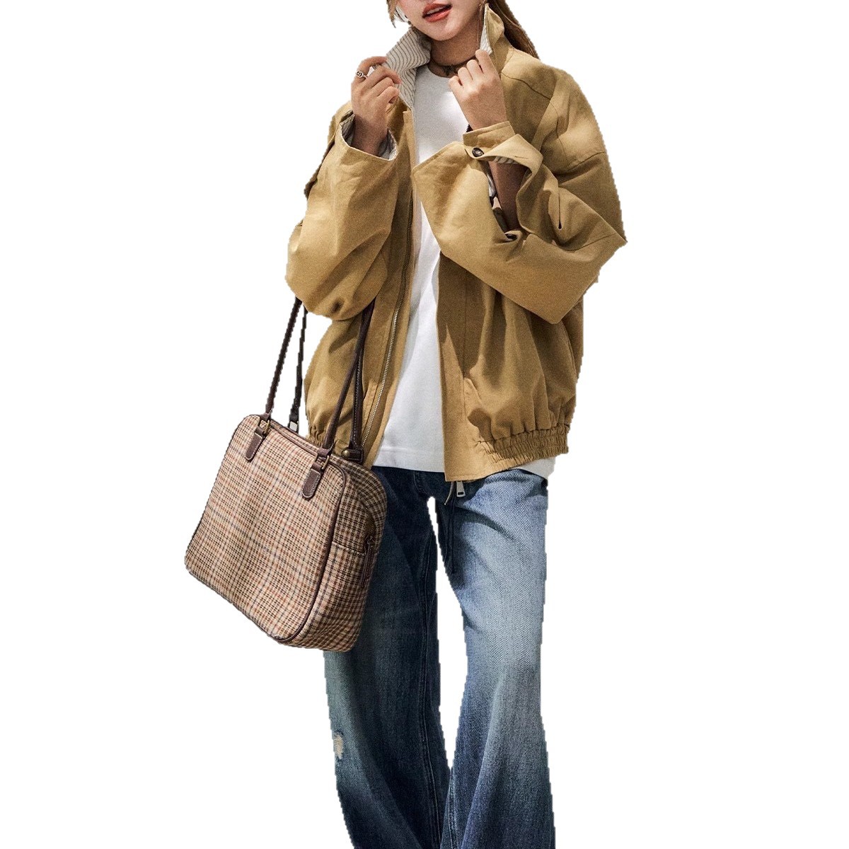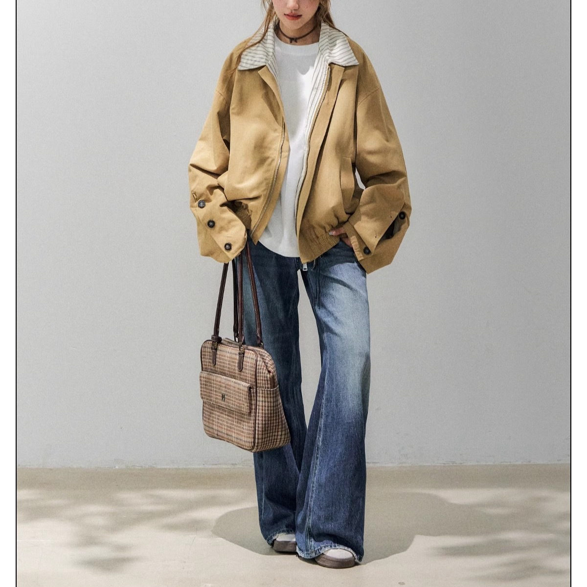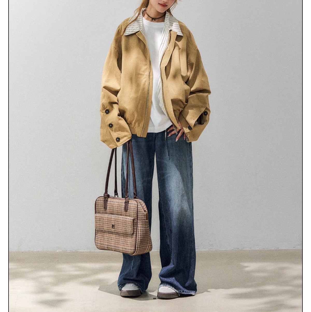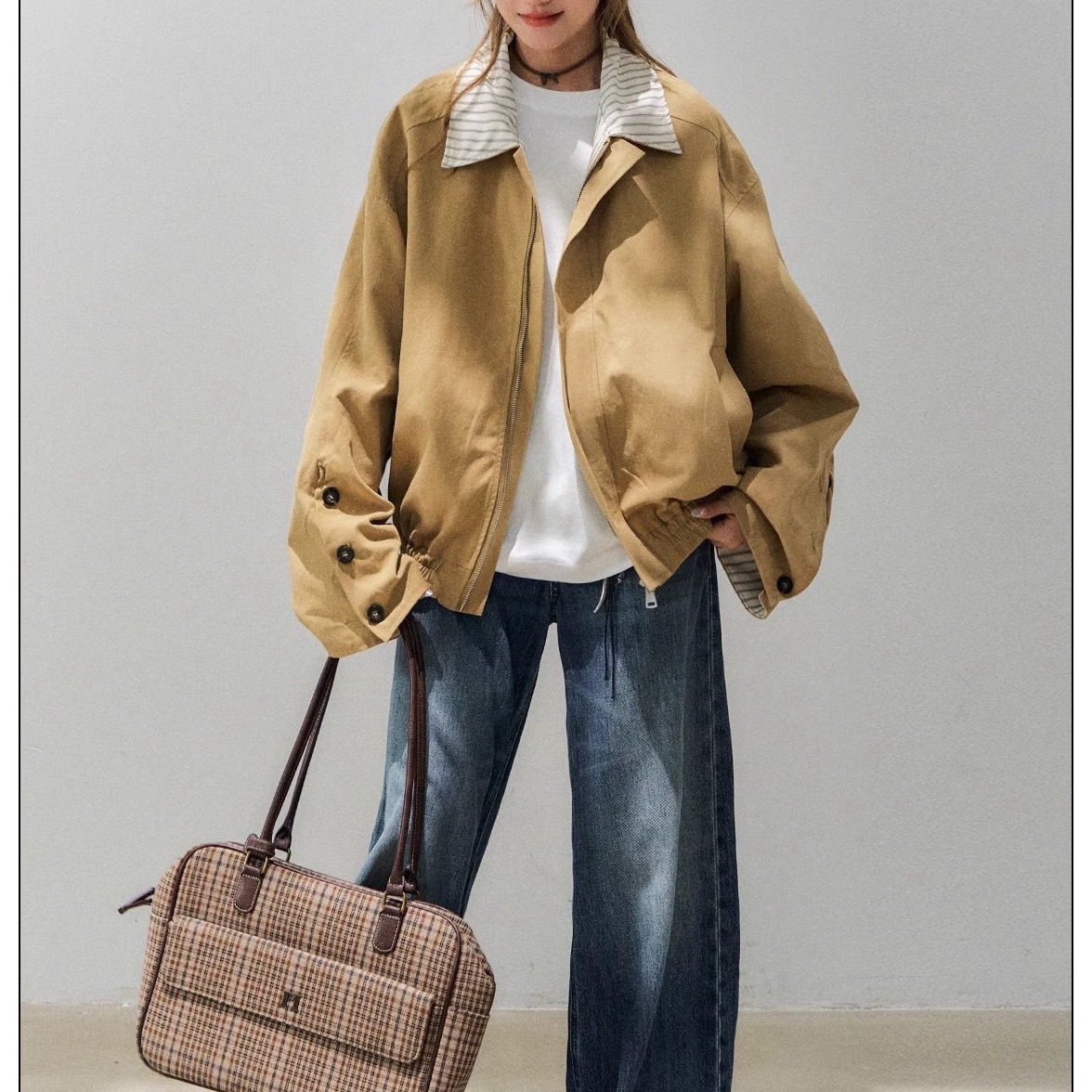 拼接条纹翻领卡其色外套女秋冬新款美式慵懒chic夹克