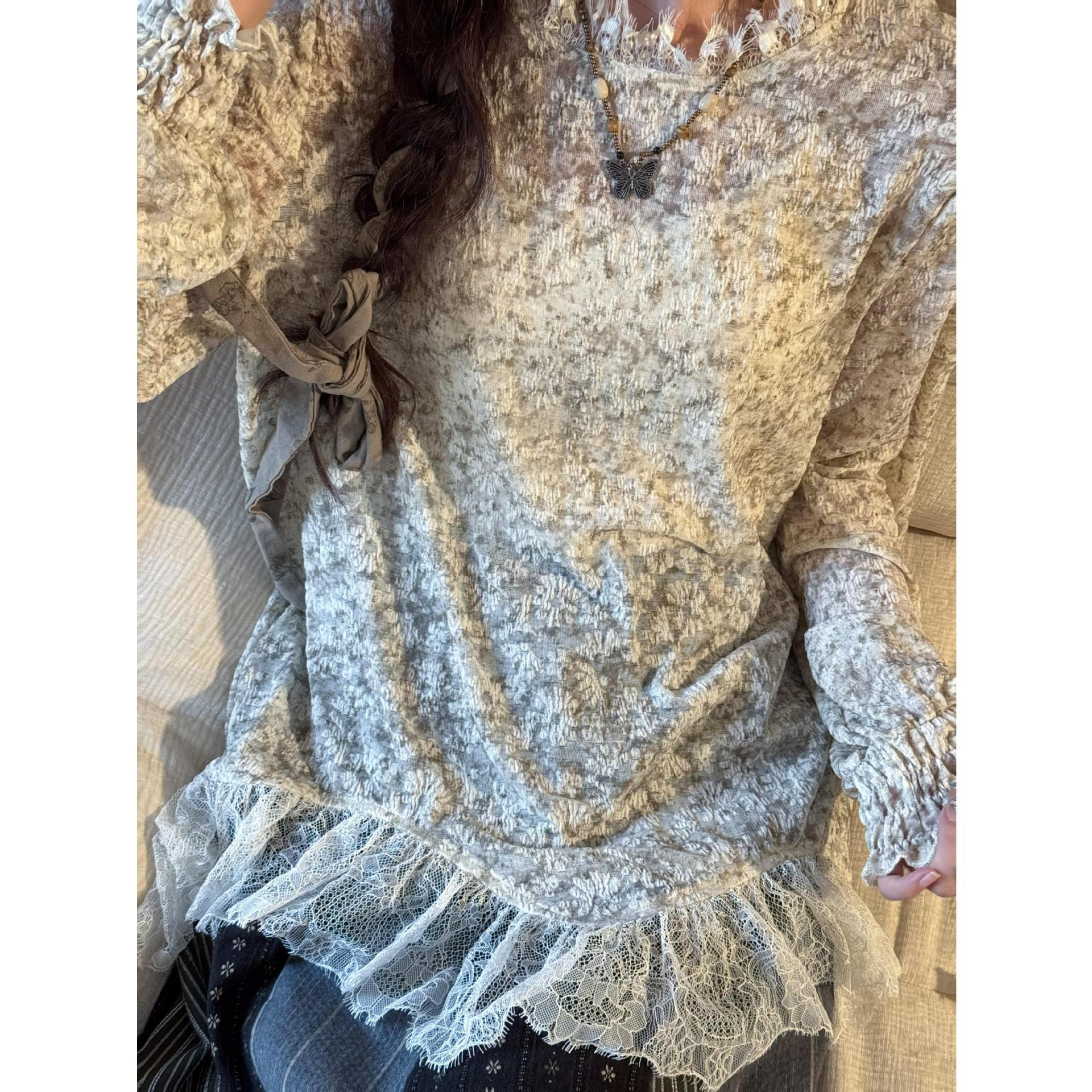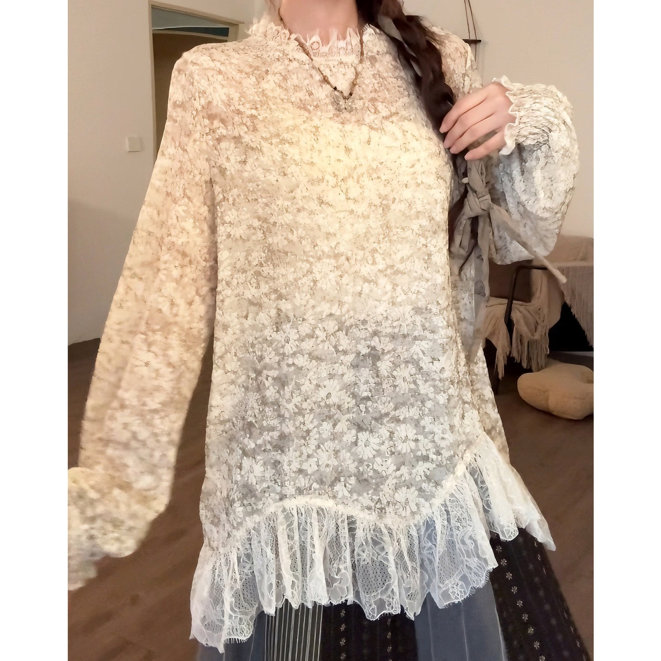 秋冬蕾丝衫【榛果可可】不规则复古碎花长袖弹力打底衫上衣