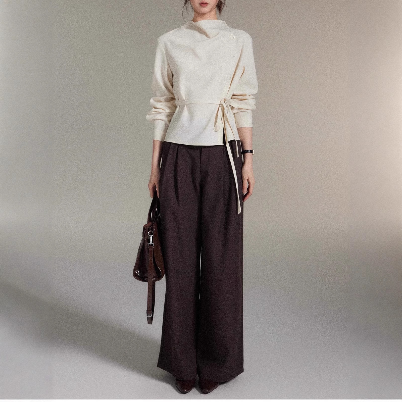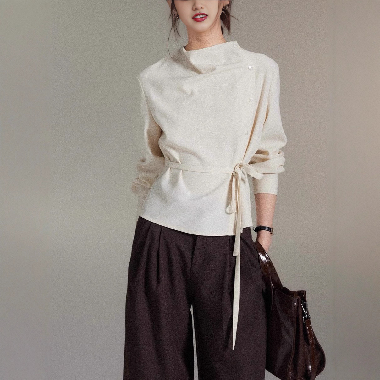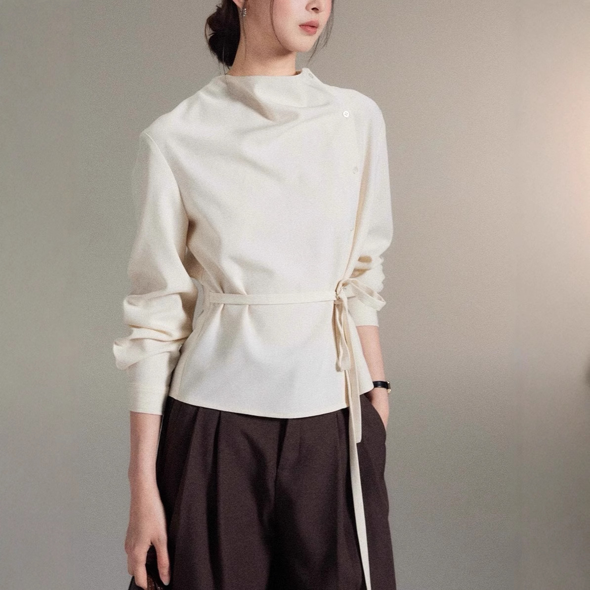贰羊设计时宜简约不对称荡领斜门襟绑带收腰上衣女高级感衬衫