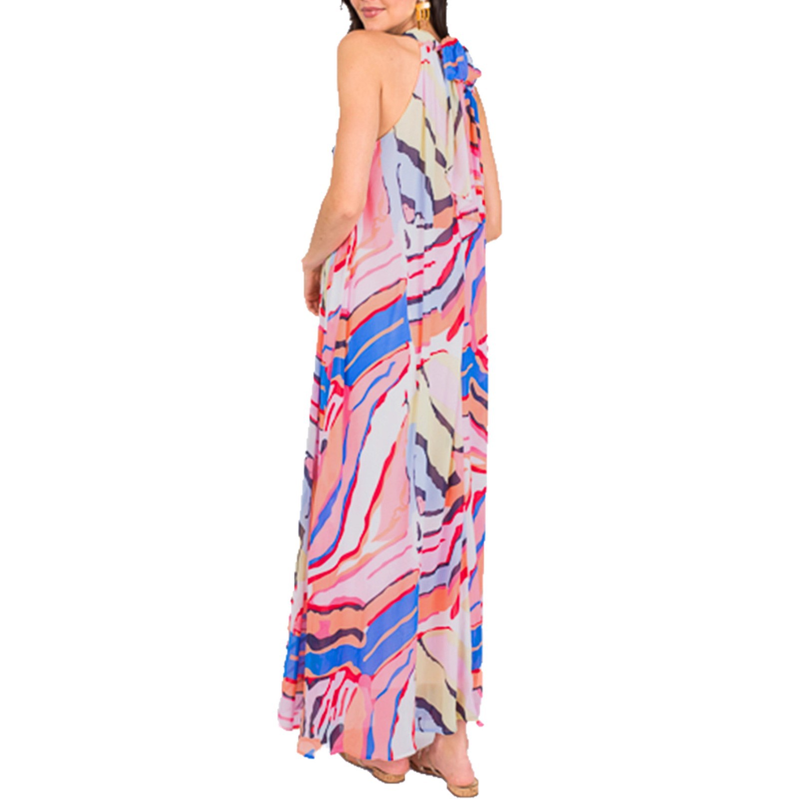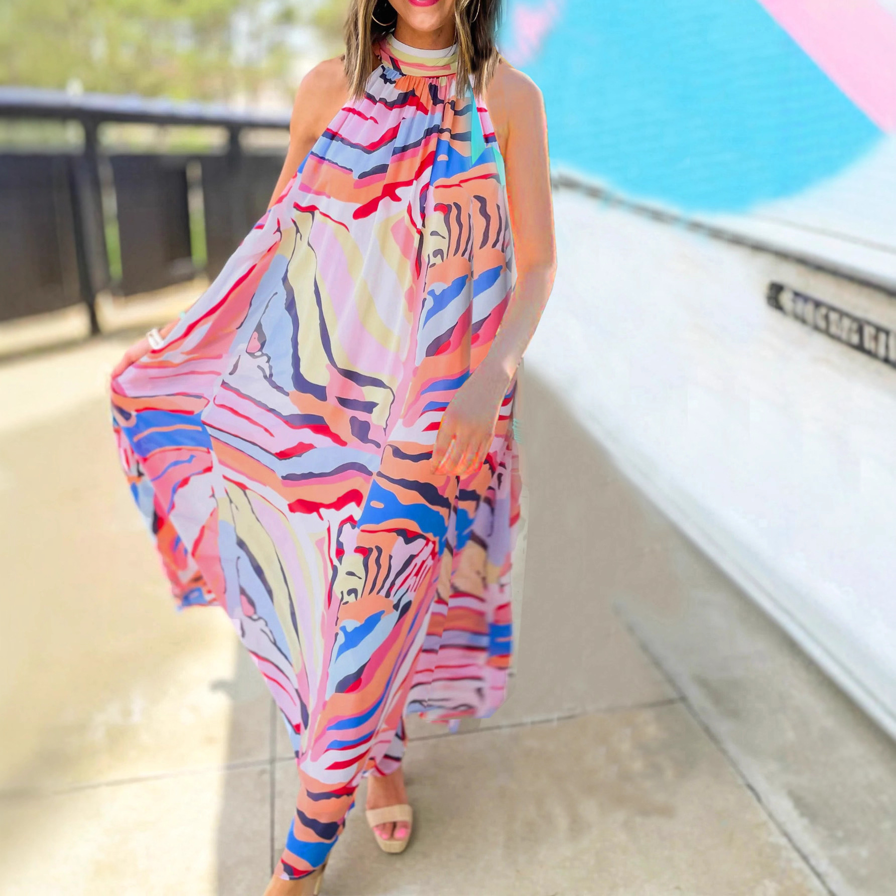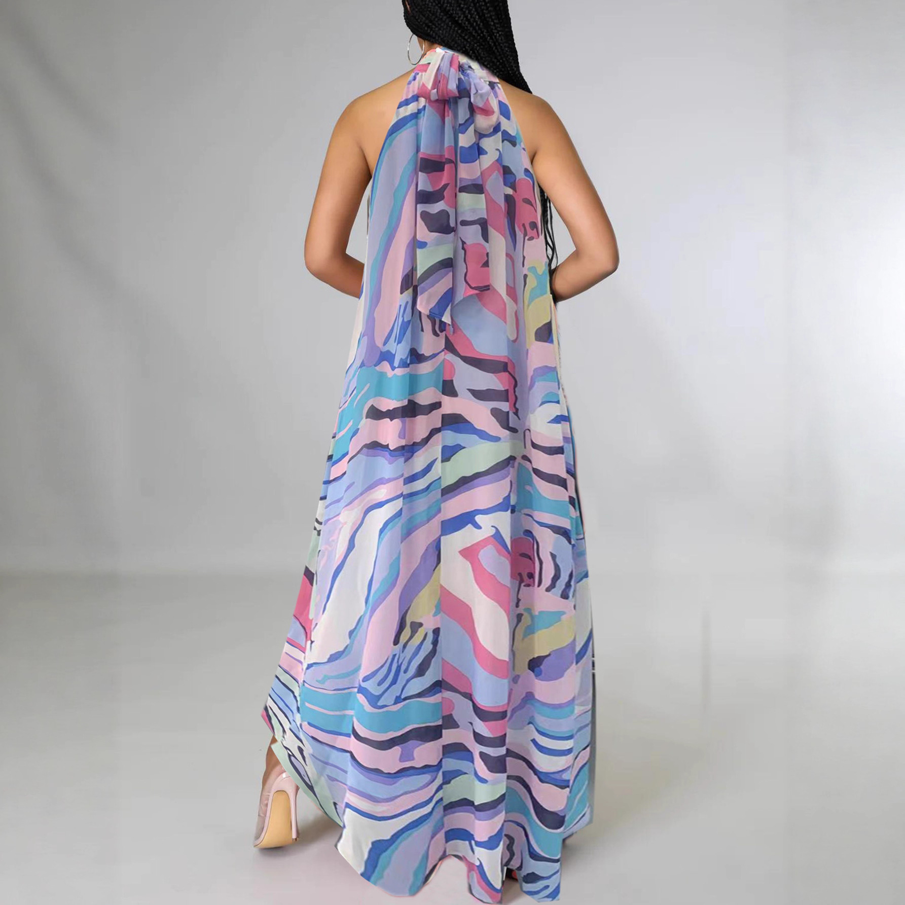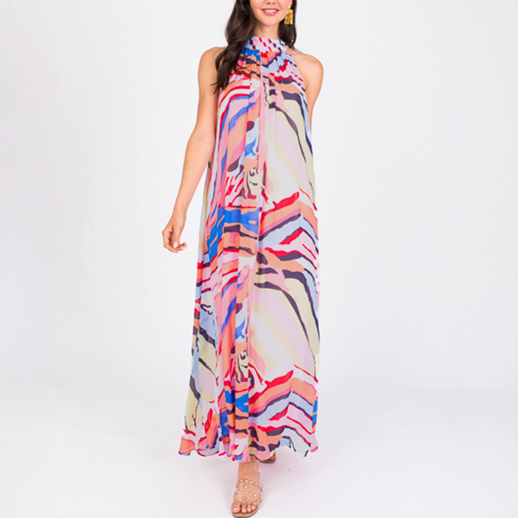 跨境无袖挂脖雪纺印花宽松舒适气质优雅连衣裙