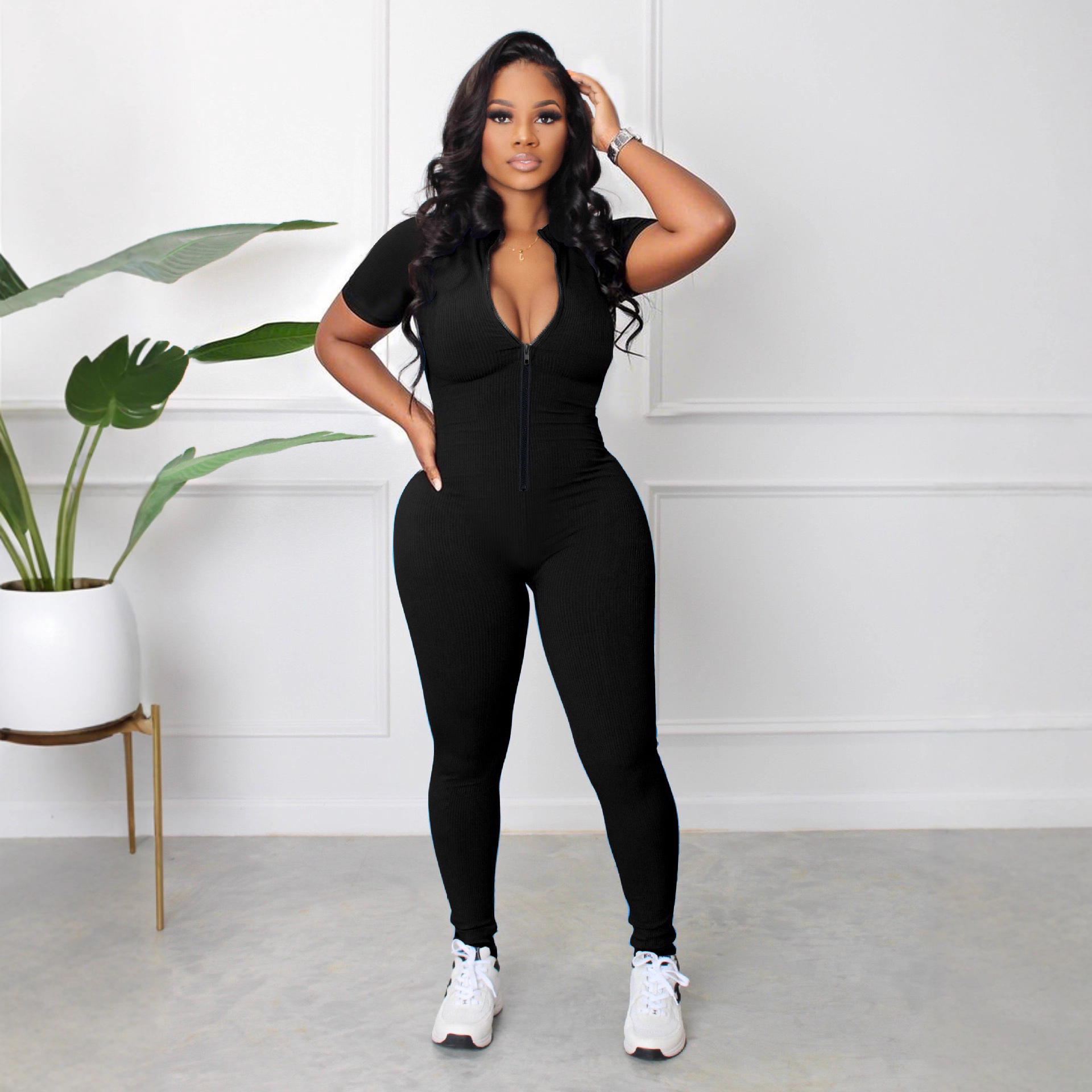 2025夏季休闲时尚修身拉链小坑条面料连体裤