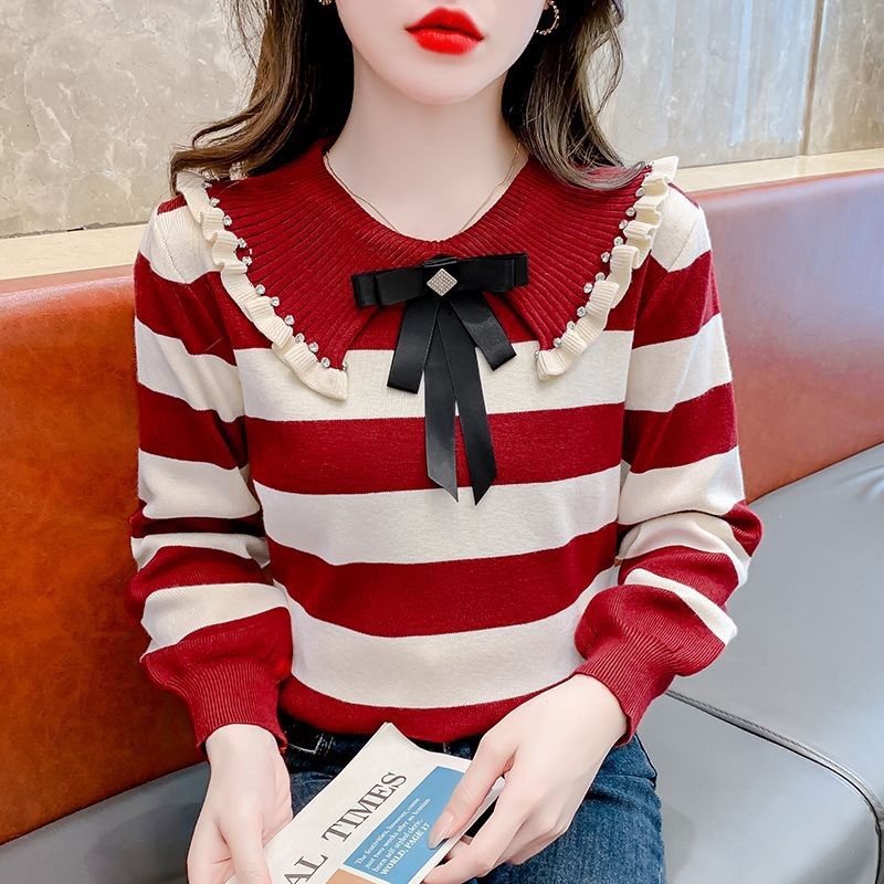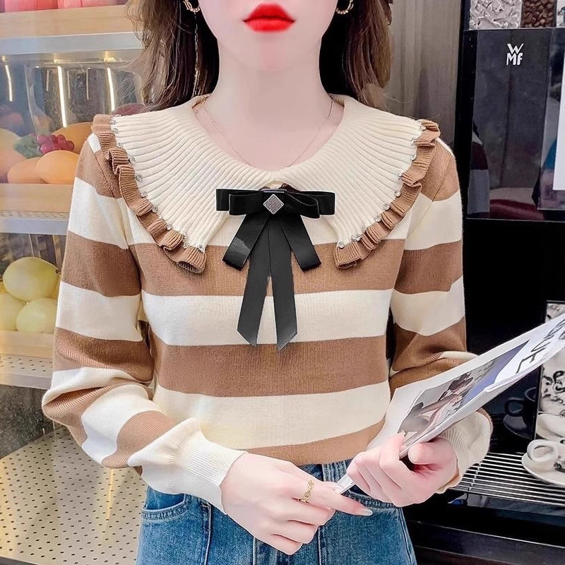 2025秋冬新款韩系复古条纹针织打底衫上衣娃娃领蝴蝶结长袖毛衣女
