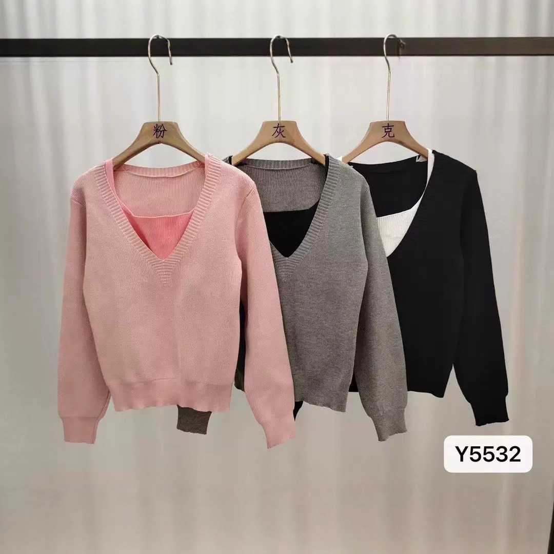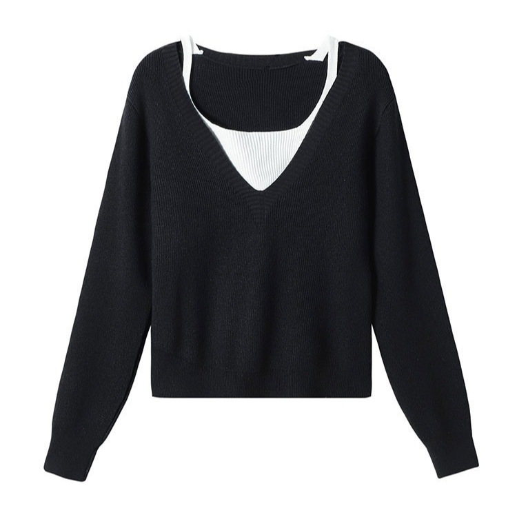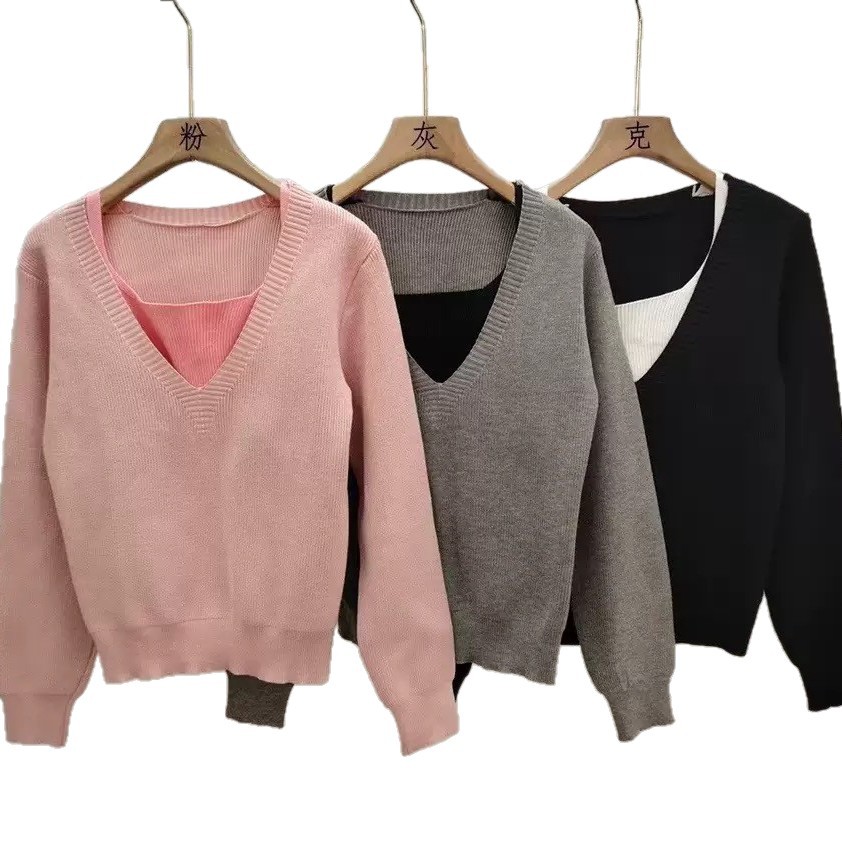 网红爆款上衣ins纯欲风针织打底衫设计感假两件V领长袖百搭毛衣女