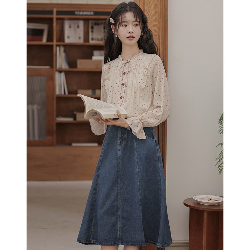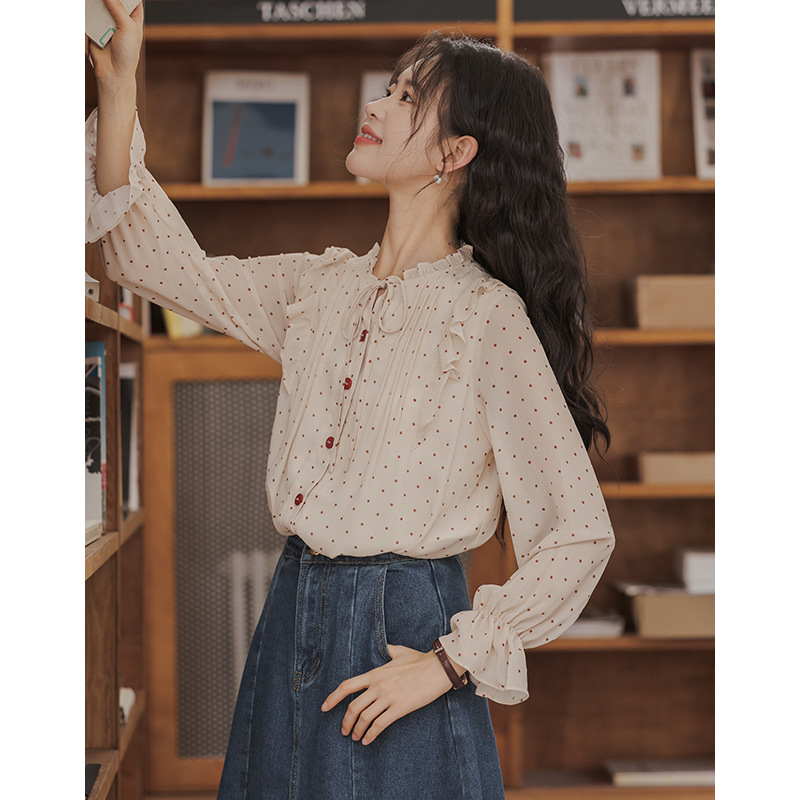 法式复古甜美木耳领褶皱波点衬衫女长袖百搭荷叶边喇叭袖衬衣上衣