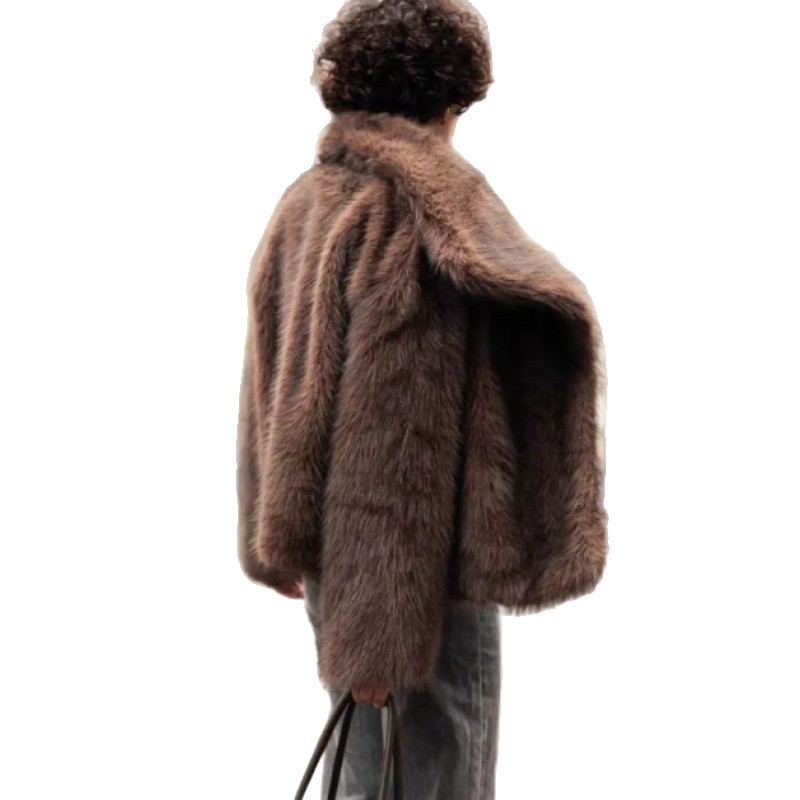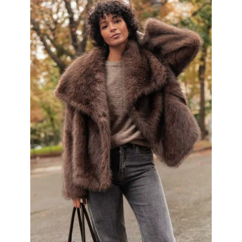 纯色翻领毛绒外套 欧美跨境秋冬新款街头潮流保暖宽松仿皮草外套