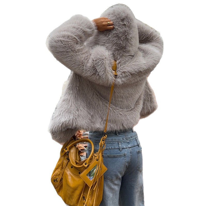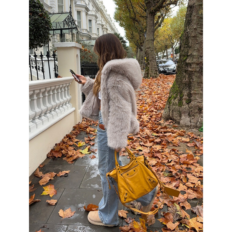 欧美跨境外贸2025冬季新款时尚百搭保暖连帽仿皮草短款外套