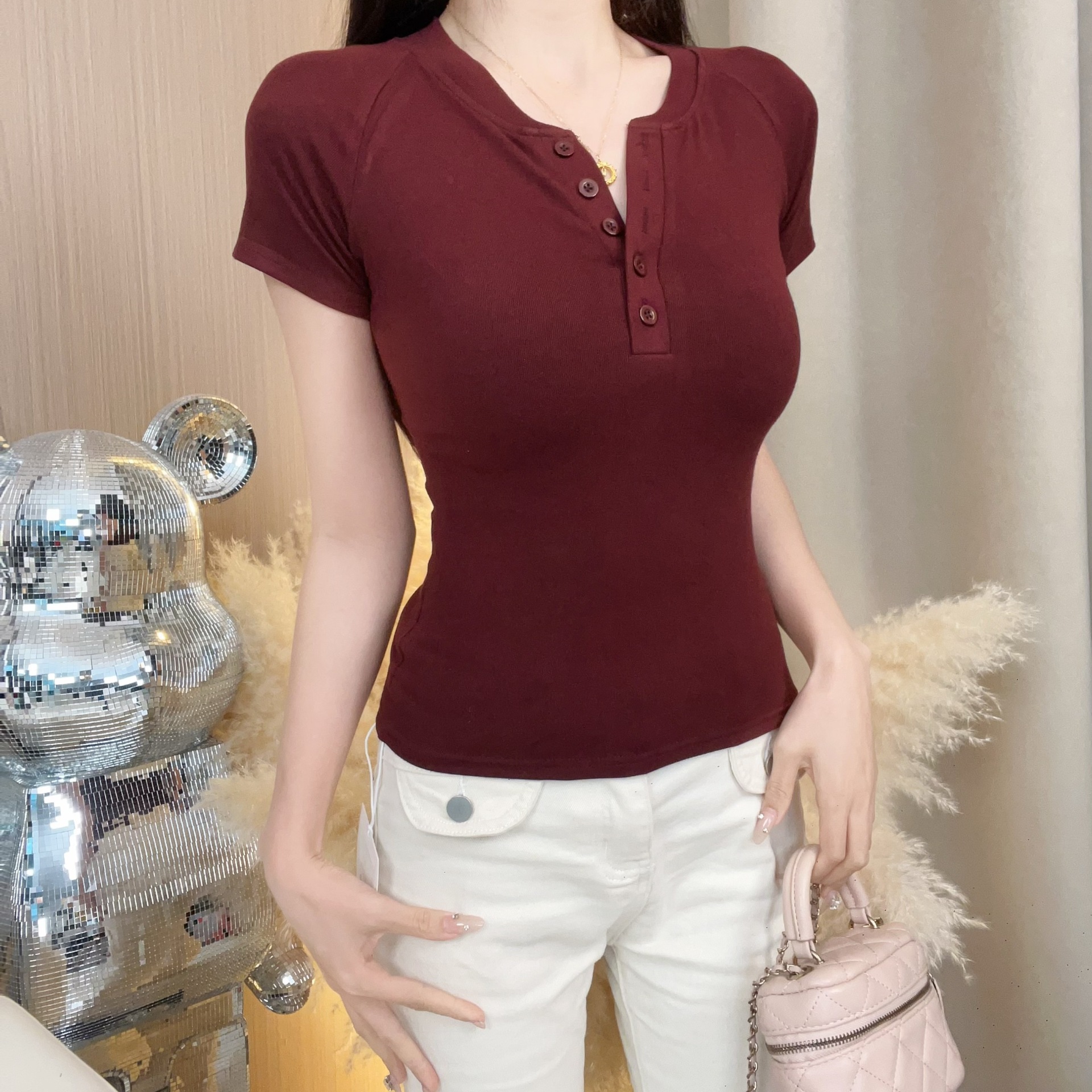 2025夏季韩版设计款领纽扣修身显瘦百搭简约纯色正肩短袖恤女.
