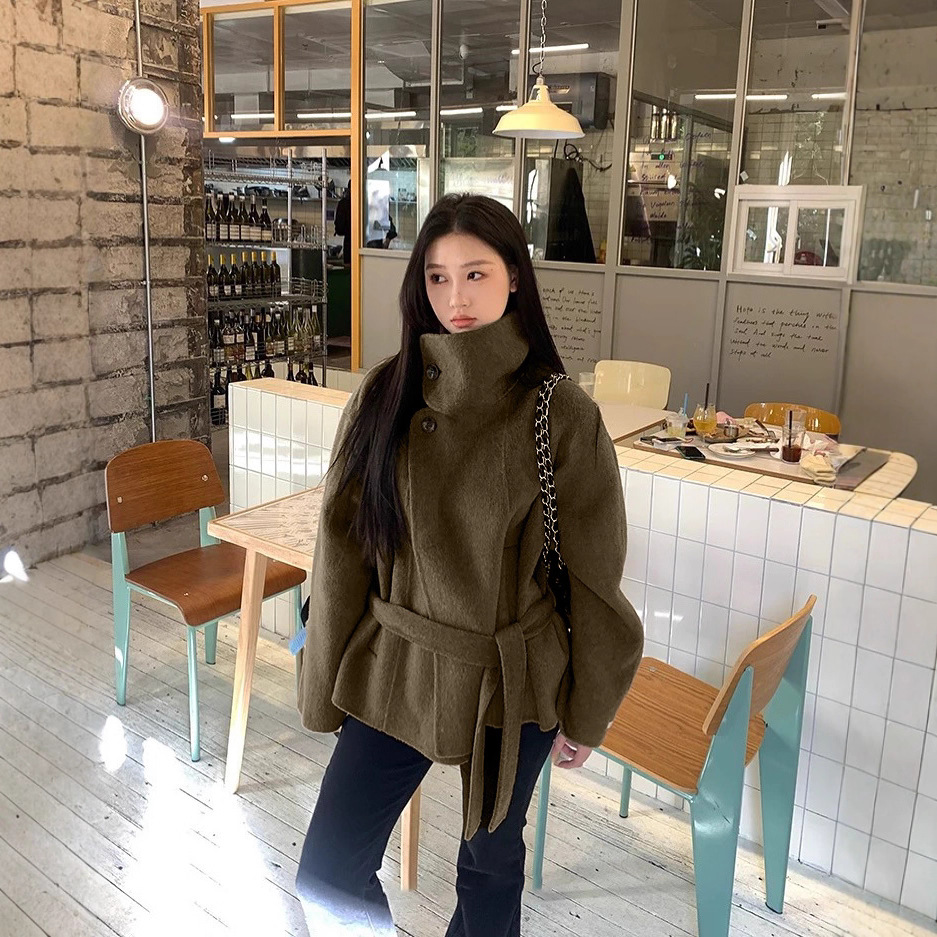 欧美跨境外贸2025秋冬氛围感韩系收腰系带立领纽扣呢子外套
