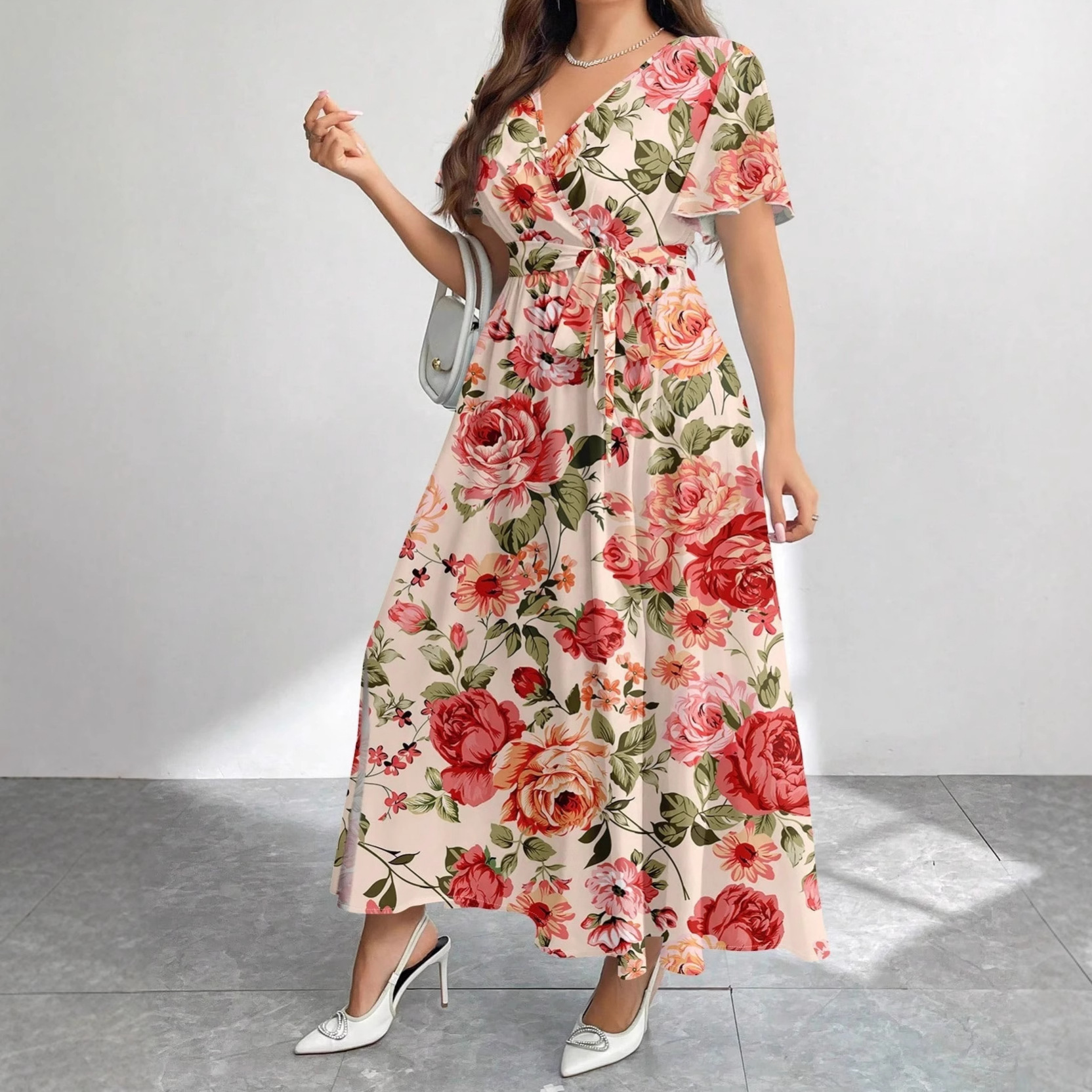 欧美女士复古花卉印花休闲宽松大码连衣裙波西米亚简约时尚V领裙