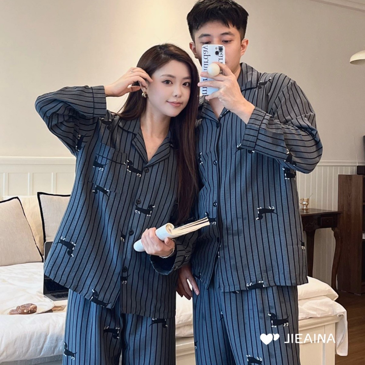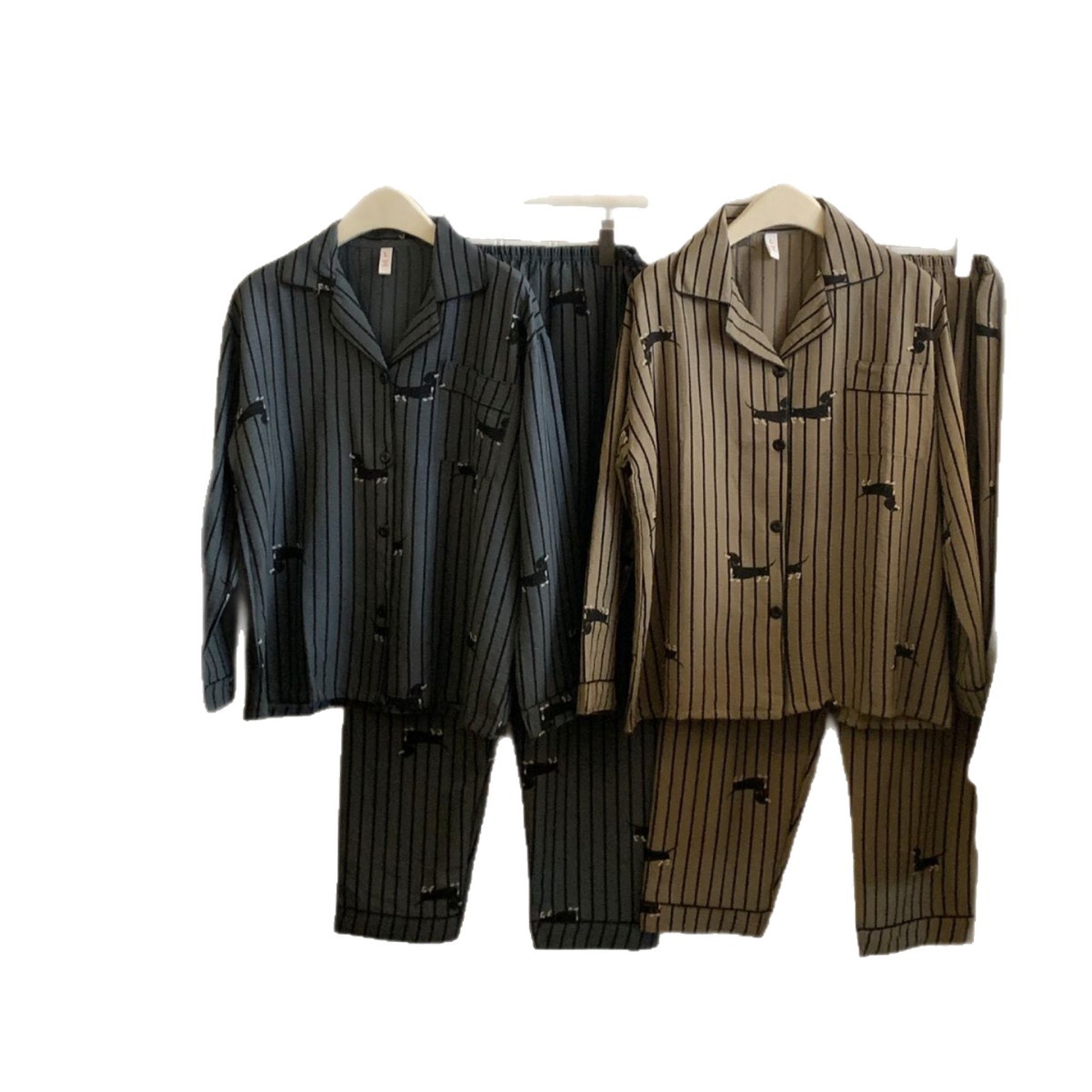 JIEAINA#W958韩系腊肠狗条纹男女同款睡衣春秋季卡通长袖翻领套装