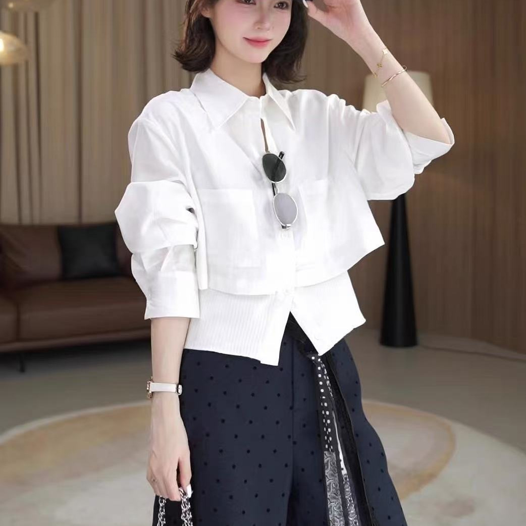 时尚假两件衬衫下摆拼接显瘦上衣2025款白色黑色其他假二件套长袖