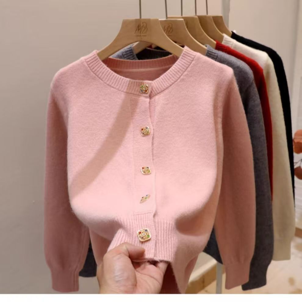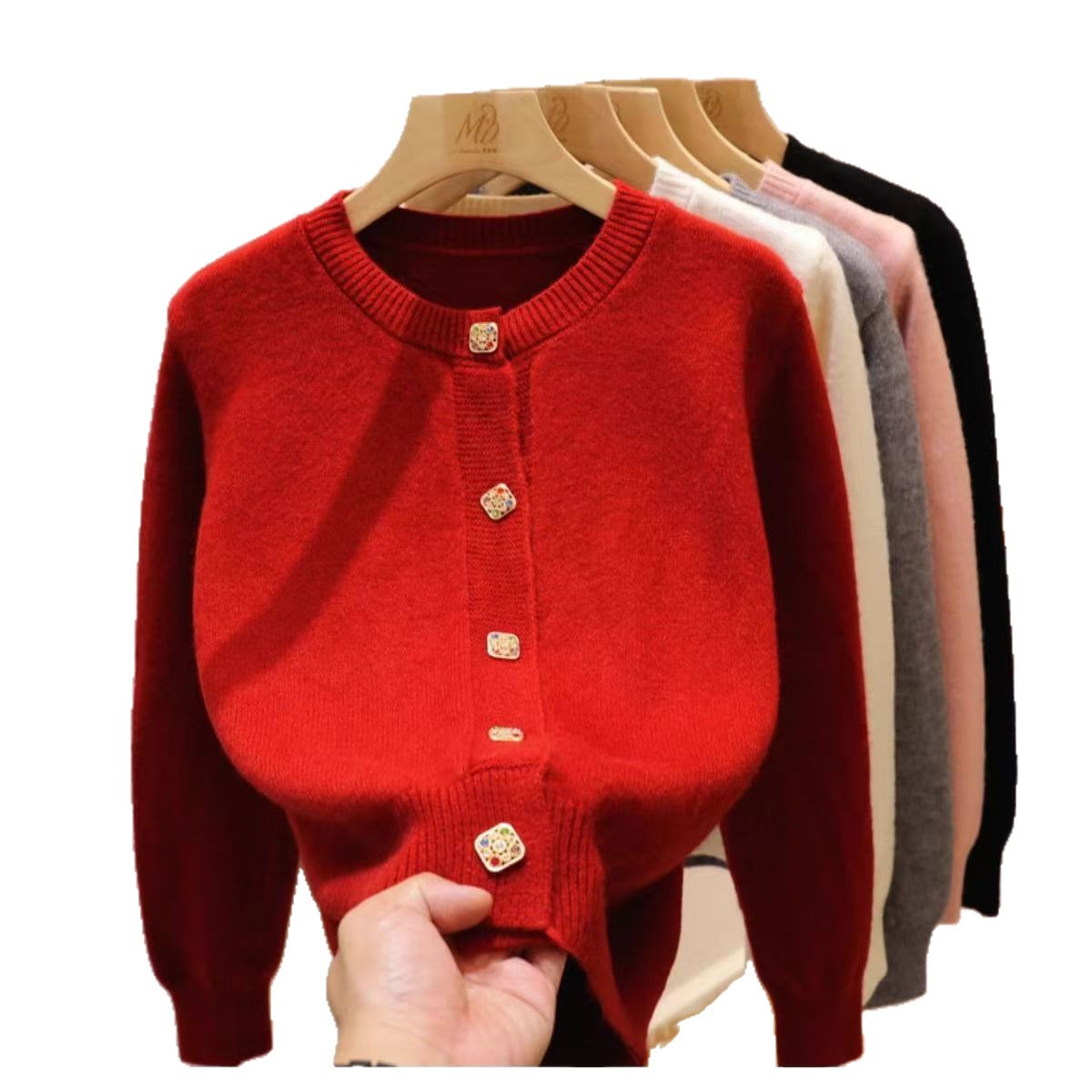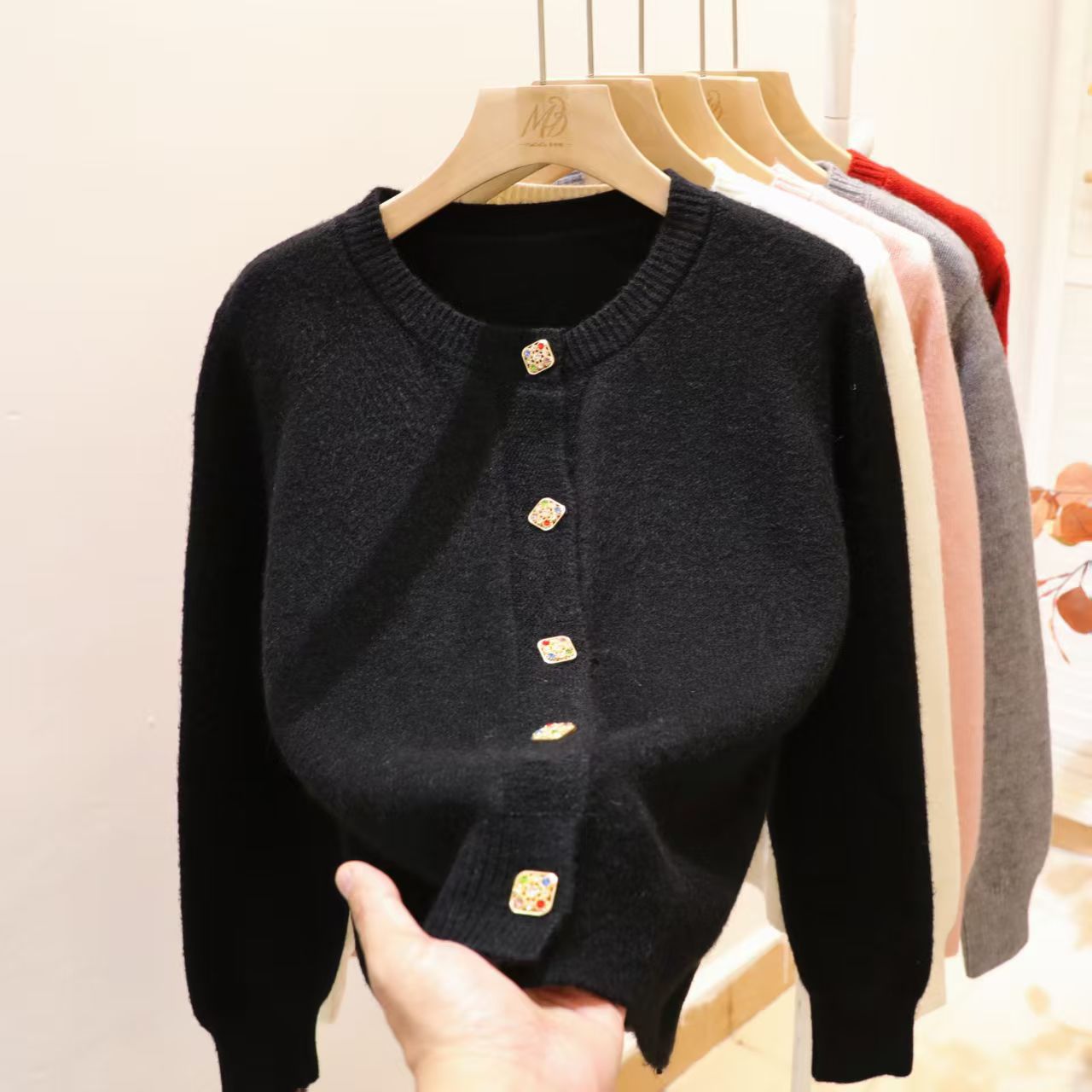 跨境女装外贸开衫针织外套高级感钻扣圆领毛衣女冬外套针织衫打底
