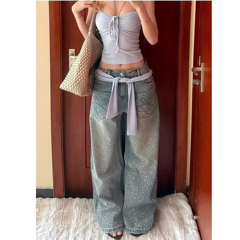 美式复古烫钻石牛仔裤女夏季新款小众满天星街头辣妹宽松阔腿长裤