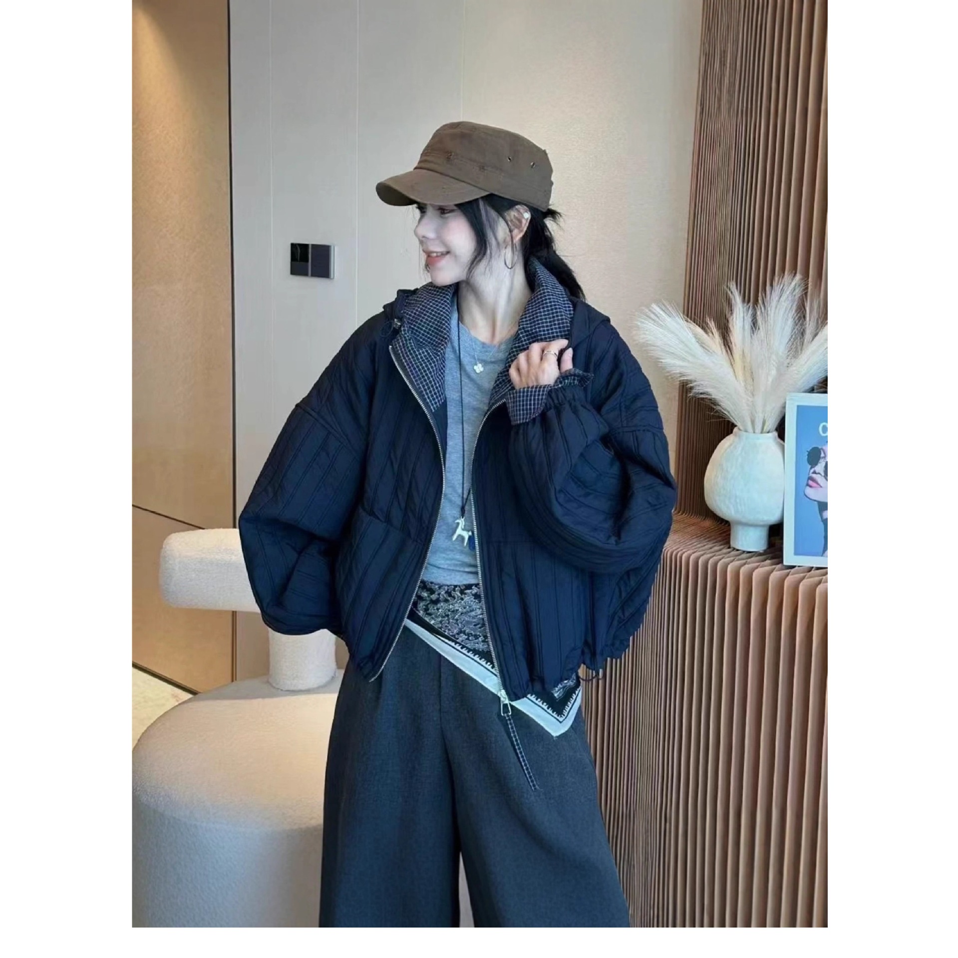 连帽夹棉短外套女格子拼接二棉夹克2025秋季新款轻薄棉服薄款棉衣