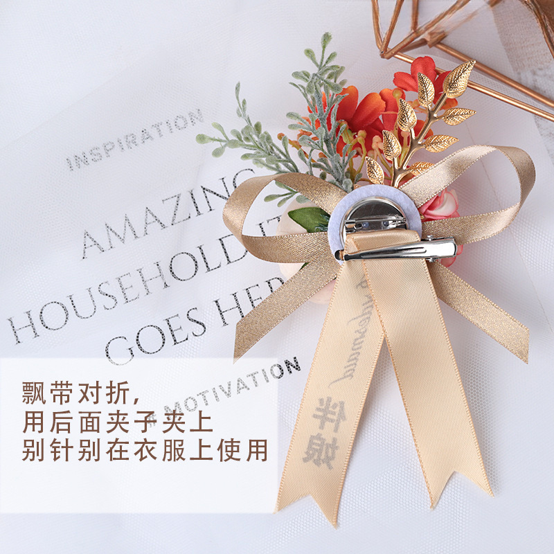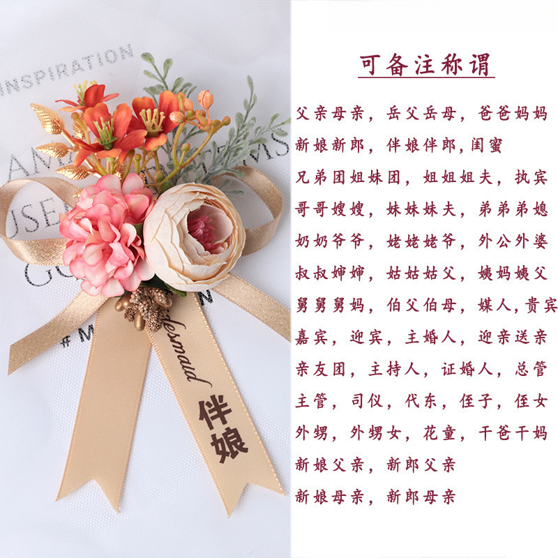 颜色 | 香槟色胸花1个+香槟色飘带 【备注称谓】 | | 颜色 | 红色胸花1个+香槟色飘带 【备注称谓】 |