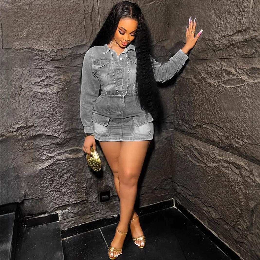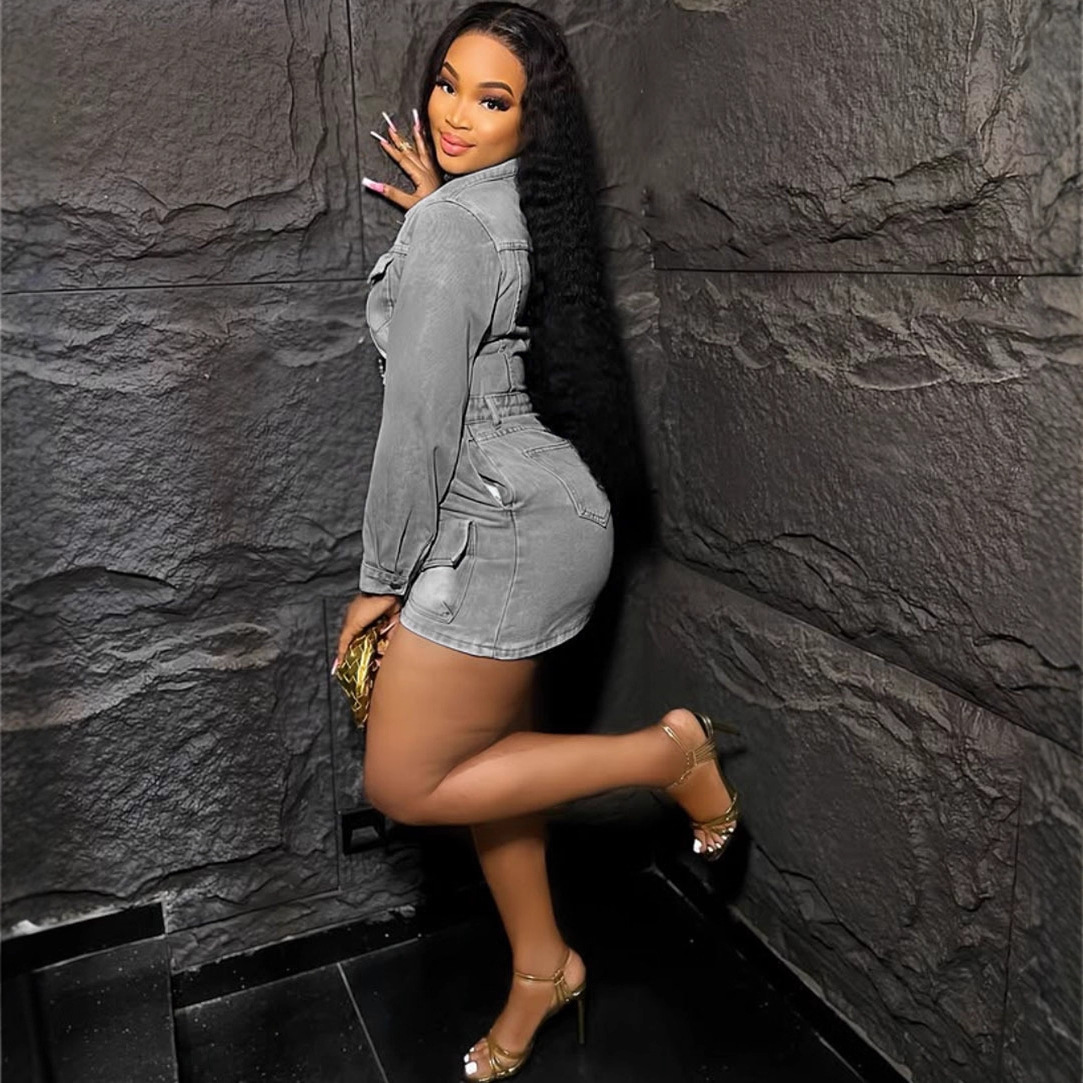 欧美女式弹力牛仔连衣裙 亚马逊跨境时尚女装多口袋水洗连身短裙