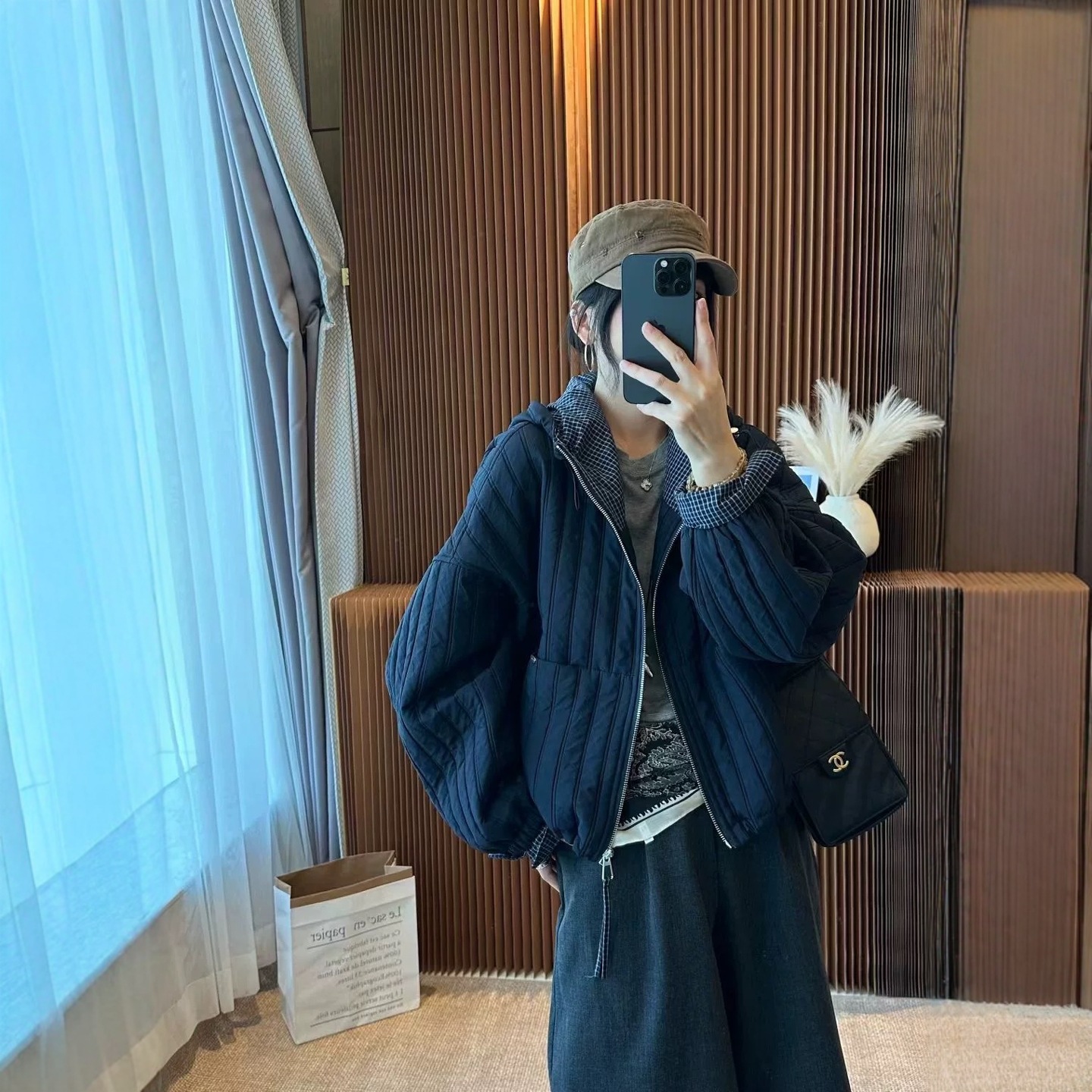 连帽夹棉短外套女格子拼接二棉夹克2025秋季新款轻薄棉服薄款棉衣