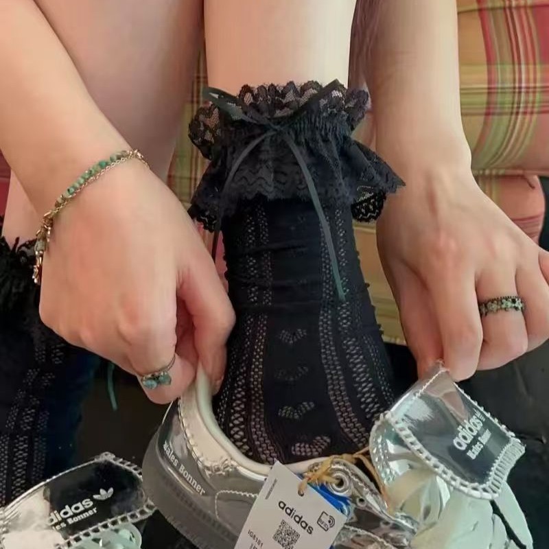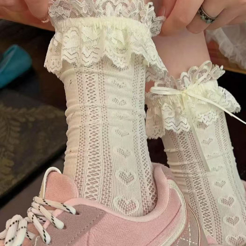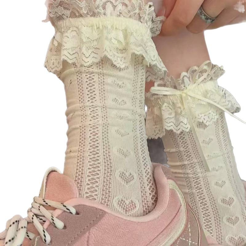 芭蕾风白色蕾丝花边蝴蝶结洛丽塔袜子女夏季薄款堆堆袜miu奶白袜