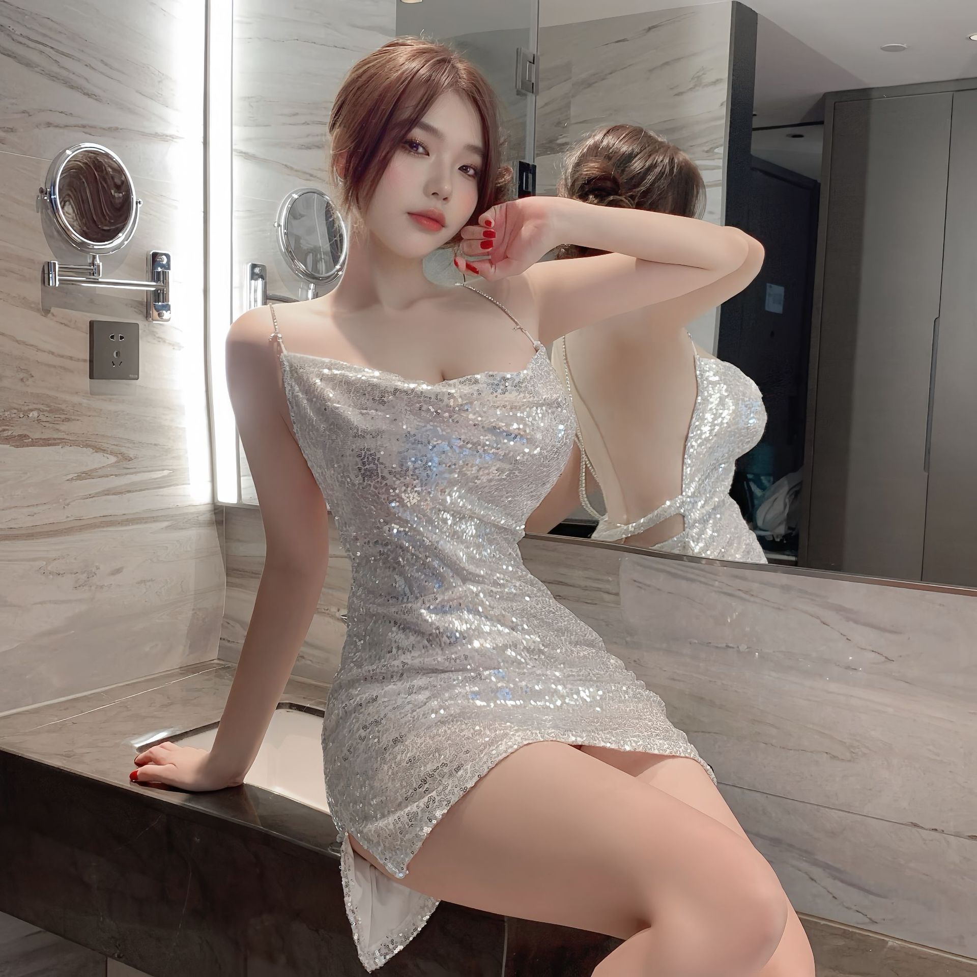 高级感挂脖大露背亮片连衣裙纯欲高腰气质修身礼服晚宴套装