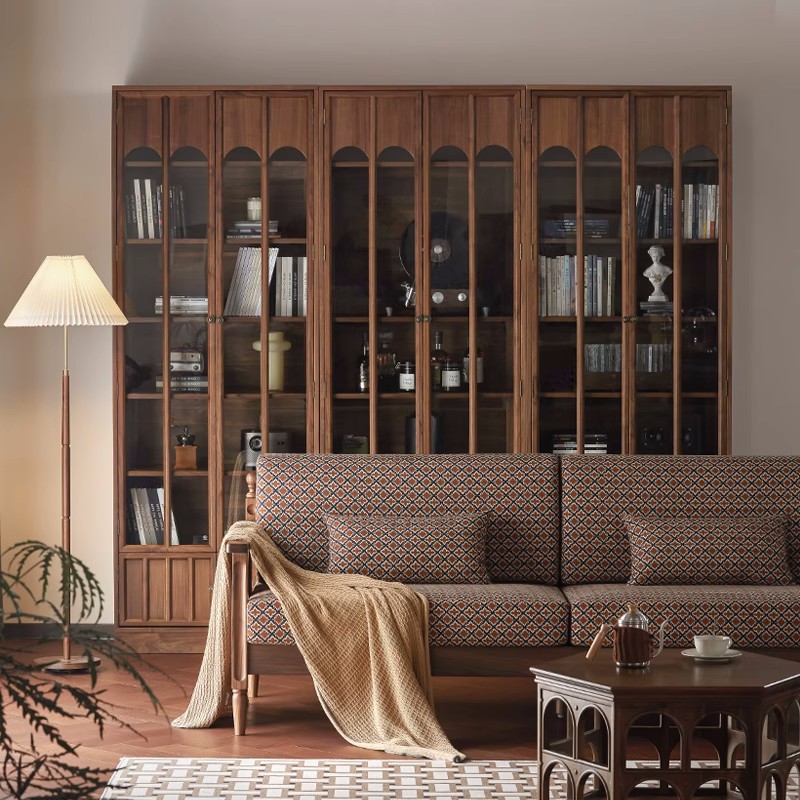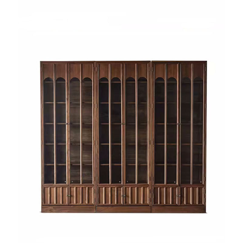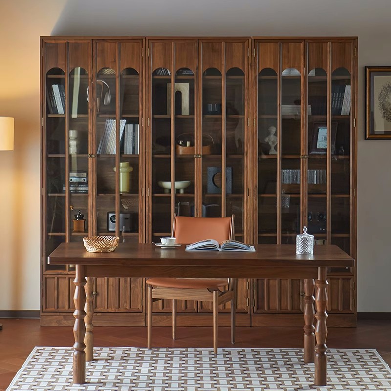 北美黑胡桃木原木高端书柜组合一体整墙到顶客厅满墙玻璃柜可定制