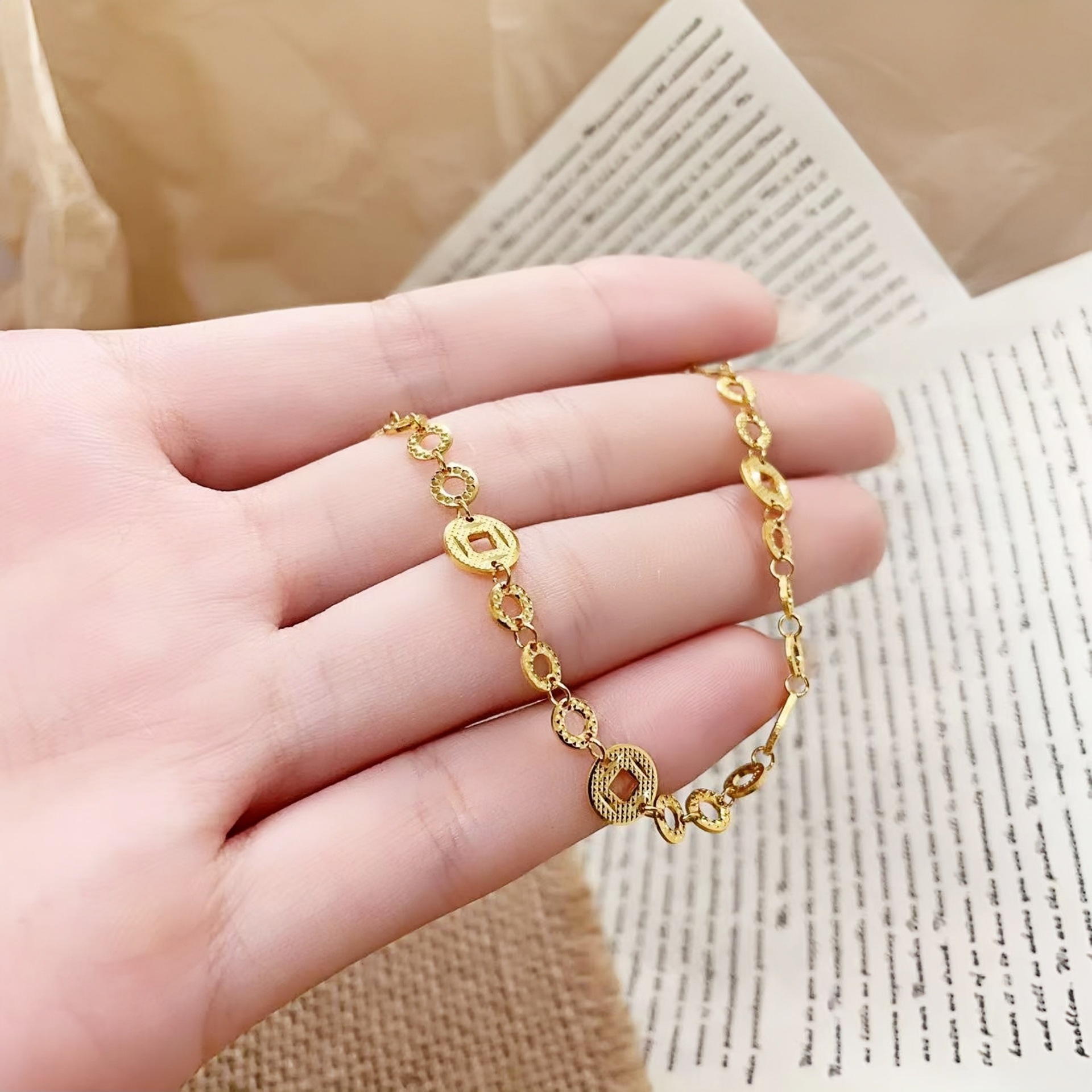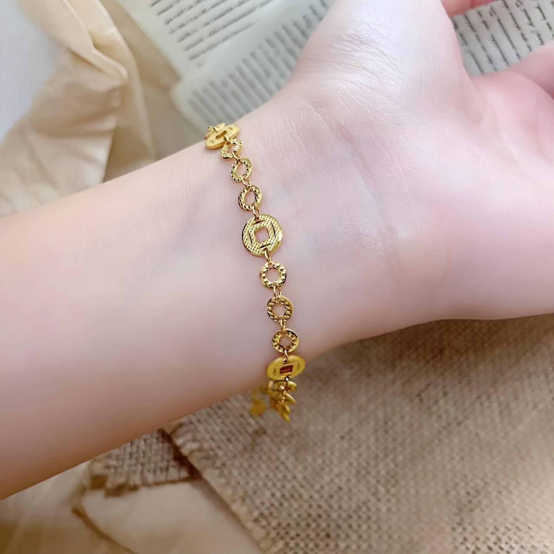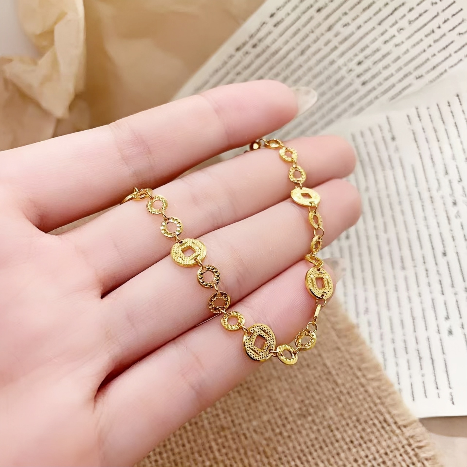 s999纯银碎冰冰金钱币手链碎碎多金手链女国风新中式钱币手串