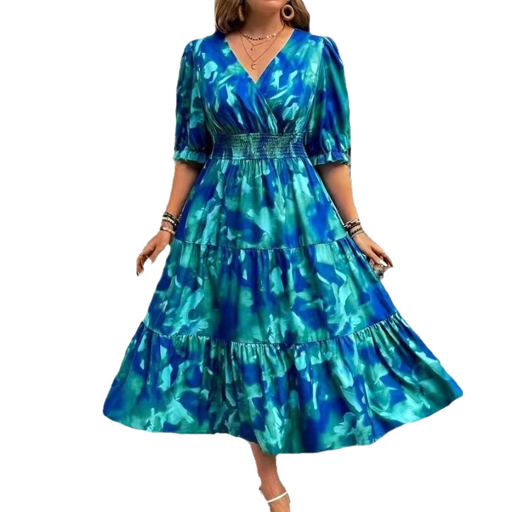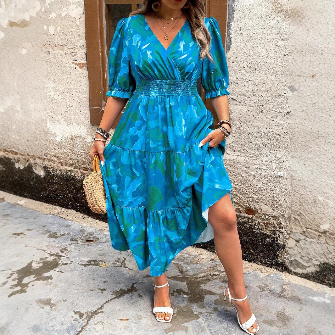 跨境2025年春季新款欧美时尚气质优雅泡泡袖印花V领连衣裙
