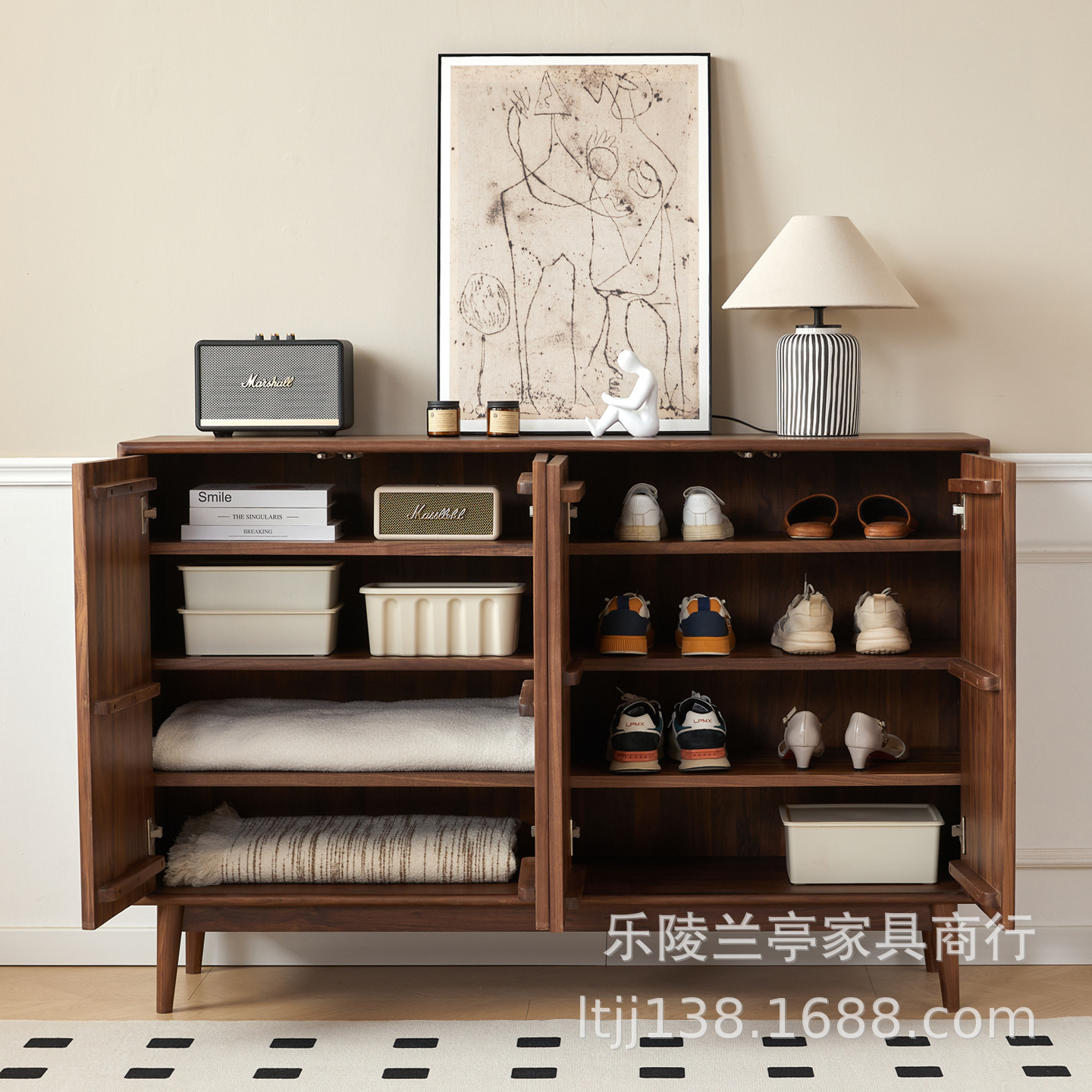 北美黑胡桃木实木多功能储物鞋柜大容量门口储物收纳柜北欧玄关柜