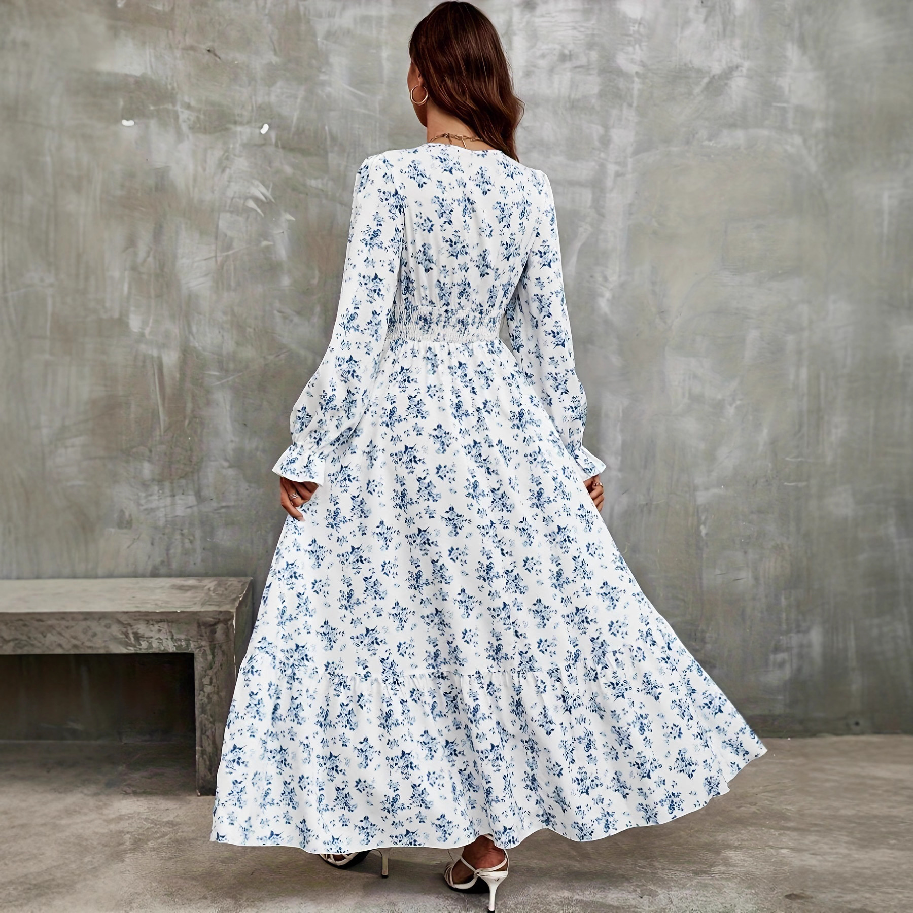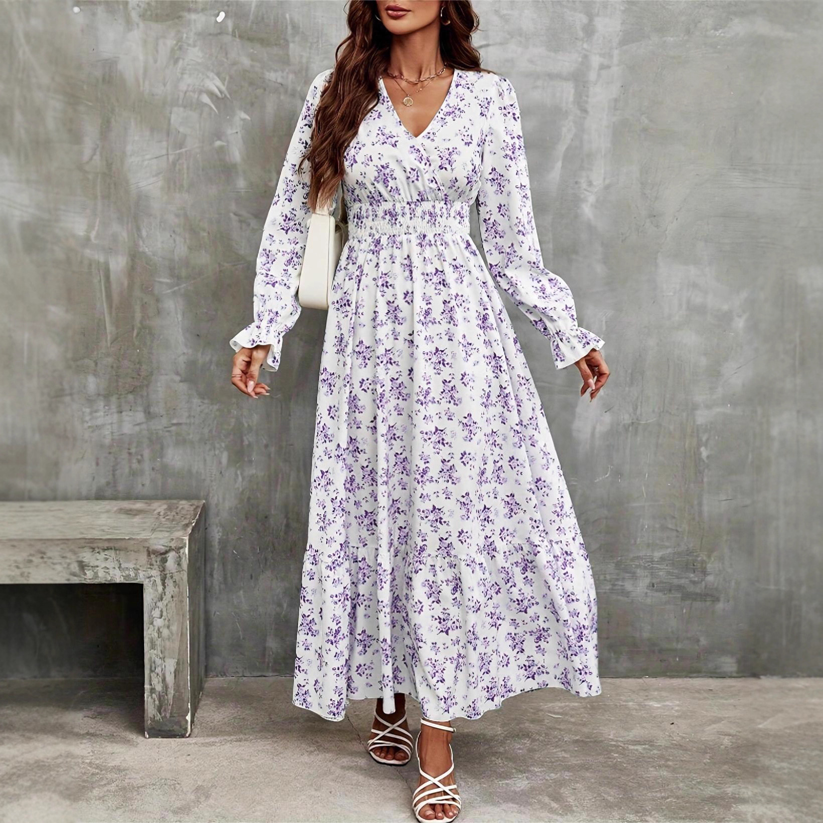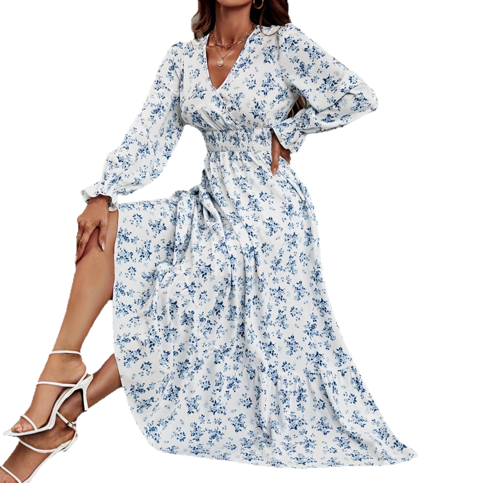 欧美跨境新款2025春夏秋V领印花女装冰激淋色气质优雅长袖连衣裙
