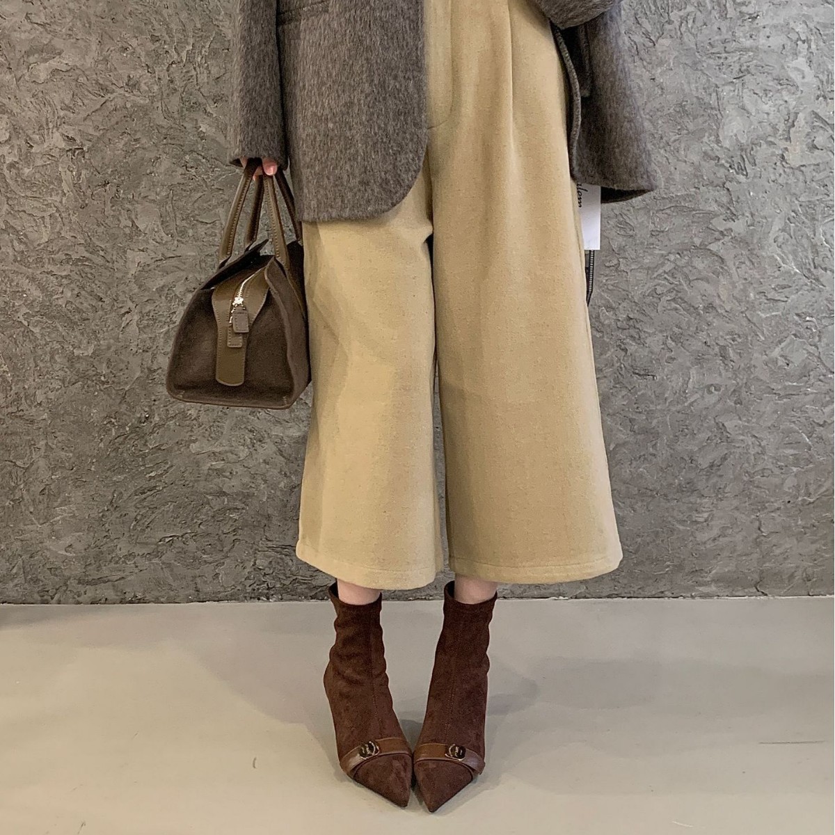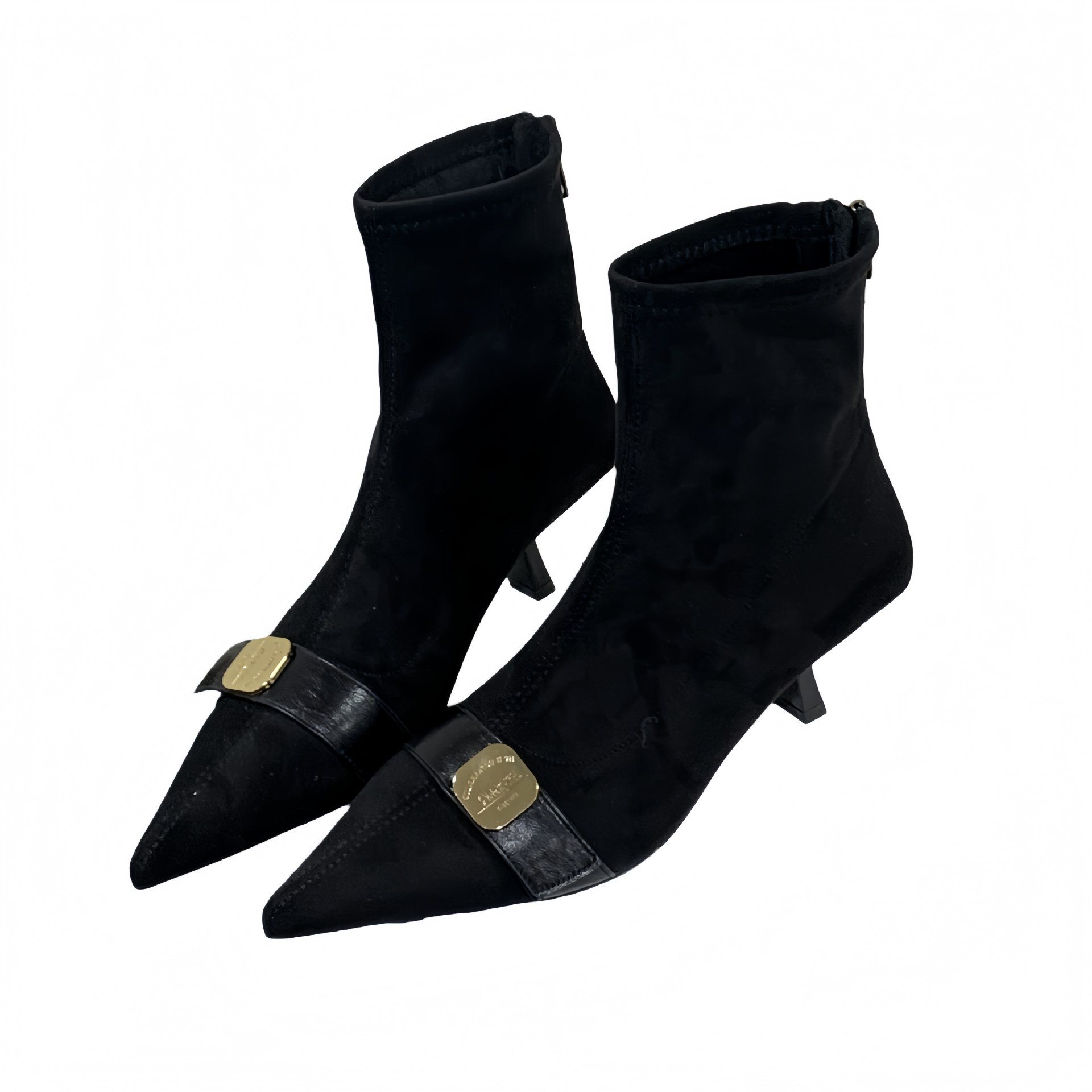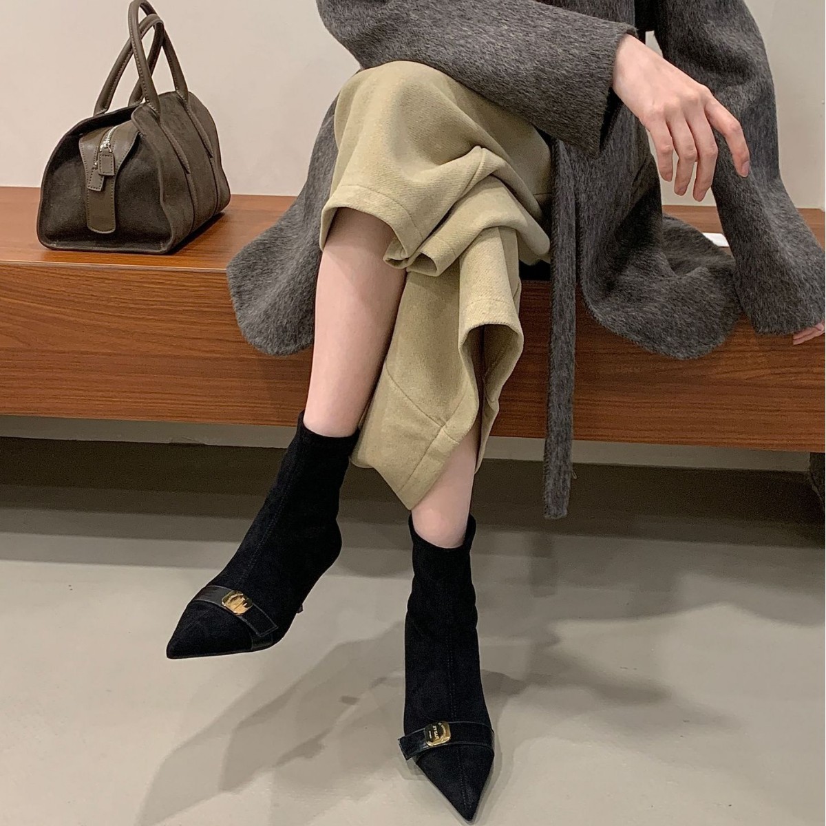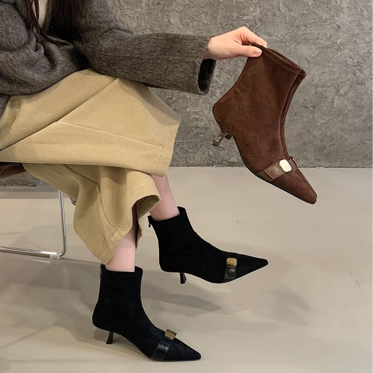 欧美尖头高跟靴绒面瘦瘦靴短靴女靴2025冬季配裙子加绒保暖女短靴
