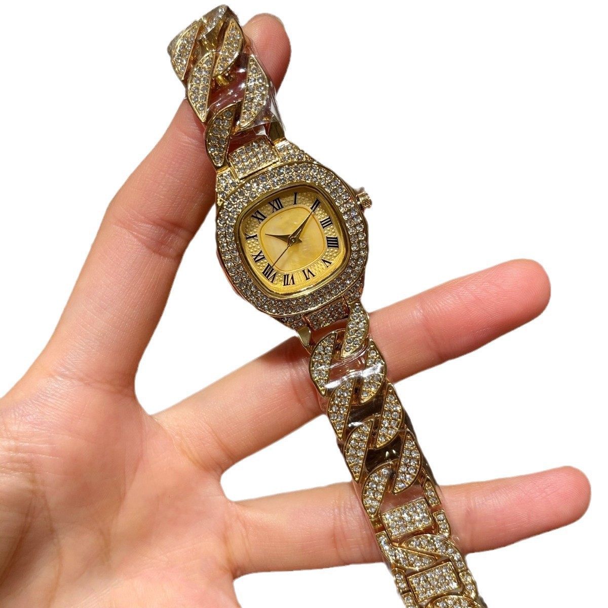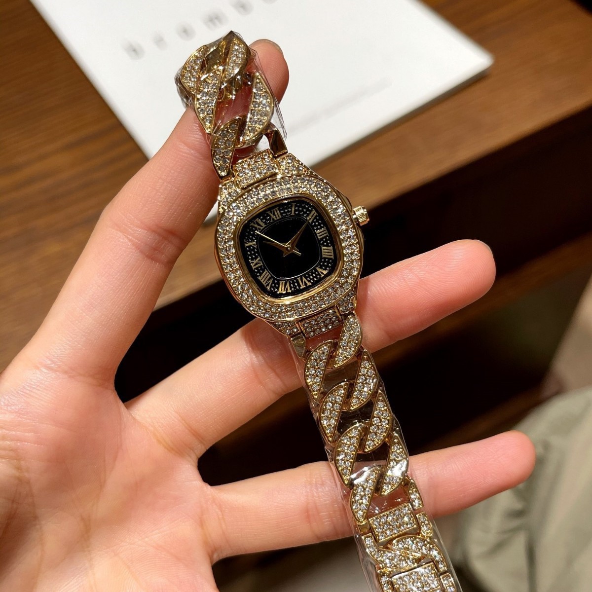 新款百达家时尚镶钻罗马字面方形表盘石英机芯钢带手表批发外贸