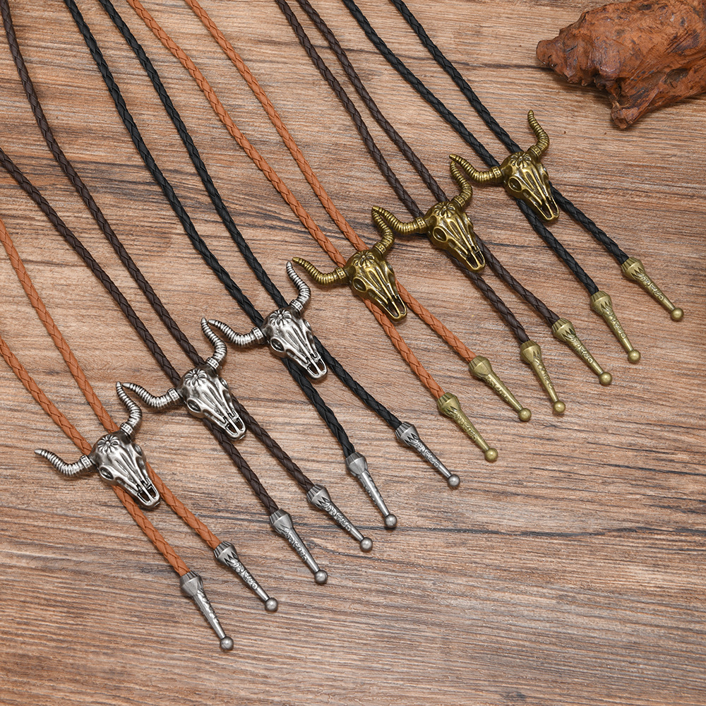 复古西部风牛头骨吊坠编织皮绳领结男女通用波洛领带项链饰品