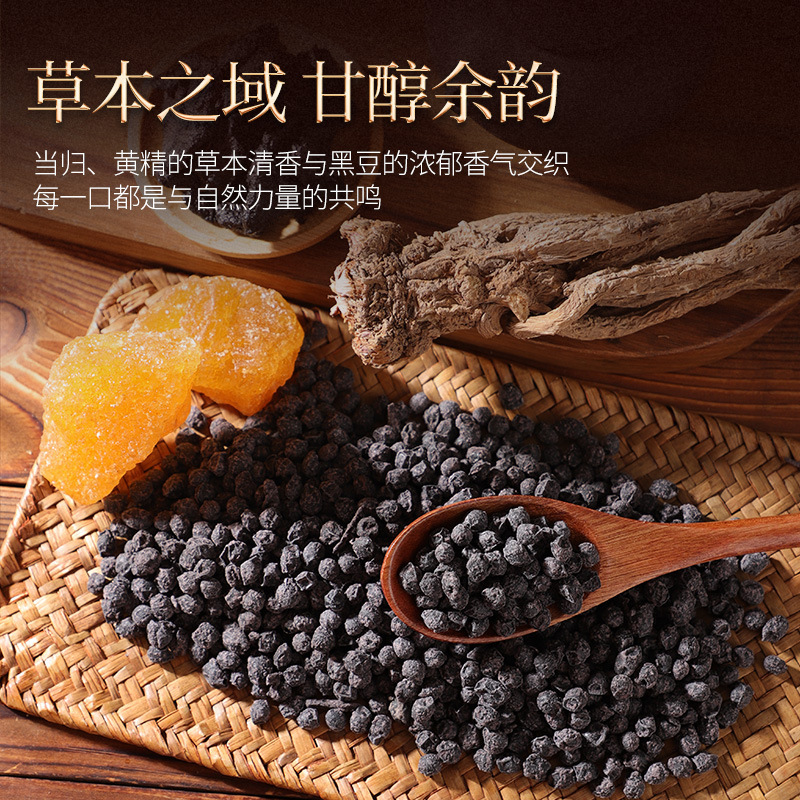 储藏方法 | 常温 | | 原料和配料 | 黑豆、当归、黄精、冰糖、食用盐 |