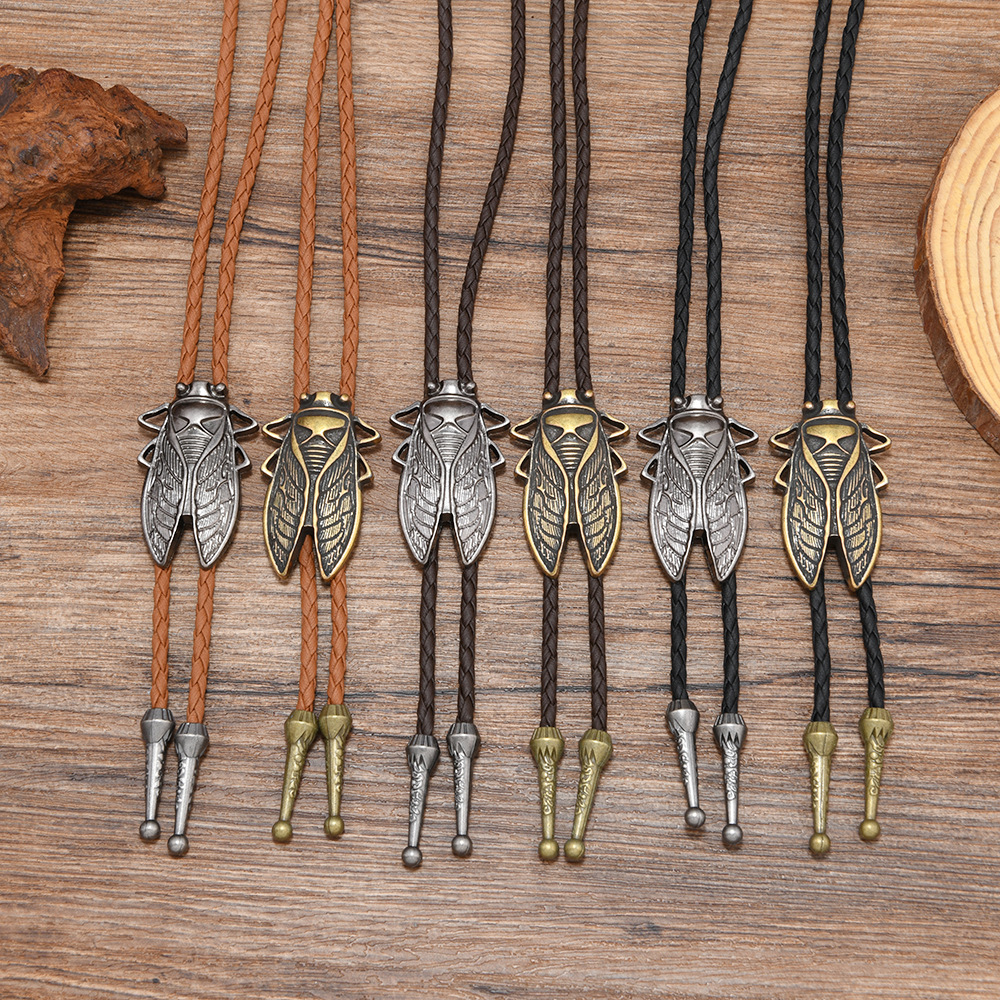 复古蝉形编织皮绳领带男女通用波洛领带合金吊坠民族风配饰