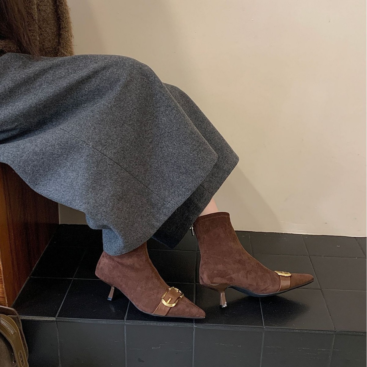 2025新款韩版粗跟中跟短靴小方头绒面皮带扣骑士靴时尚气质瘦瘦靴