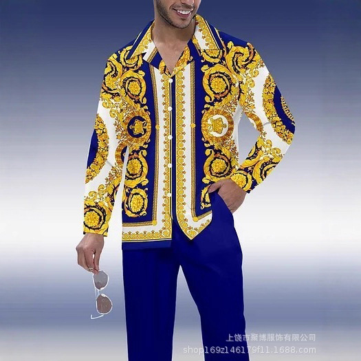 美式跨境2025新款休闲时尚湖流线条男士长袖村衫长裤套装满版印3d
