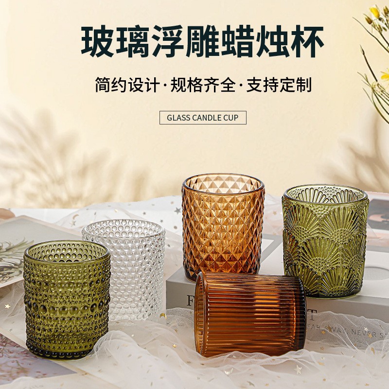 新款现货200ML浮雕蜡烛杯琥珀色香薰烛台绿色花纹蜡烛杯香薰空杯