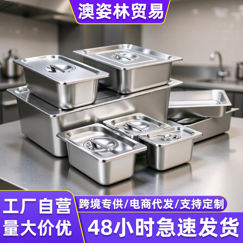 ✅跨境不锈钢份数盆长方形盆带盖商用食物盆快餐车自助餐盛菜盆