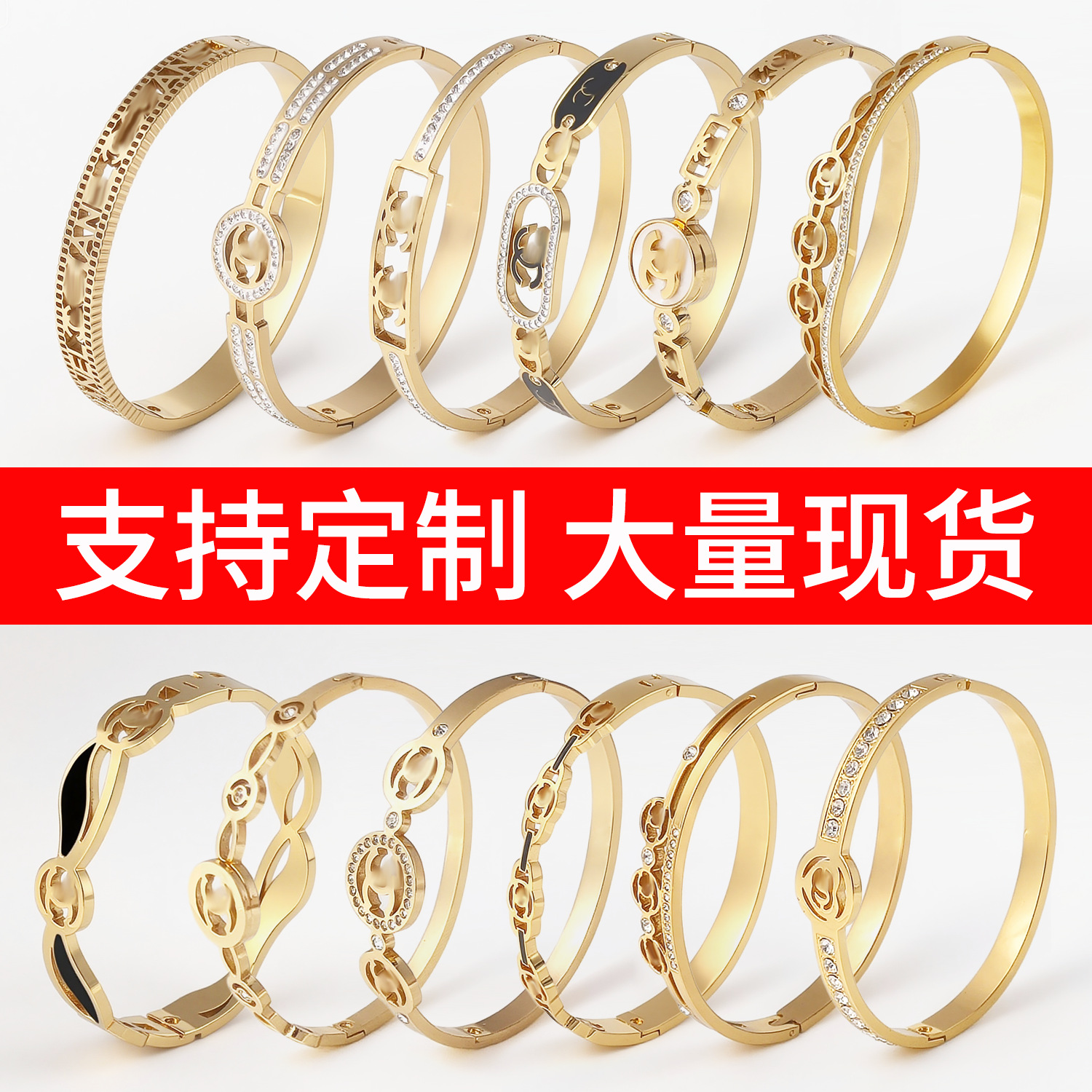 欧美跨境香家双c钛钢手镯不掉色饰品小香风手环光面镶钻手饰首饰
