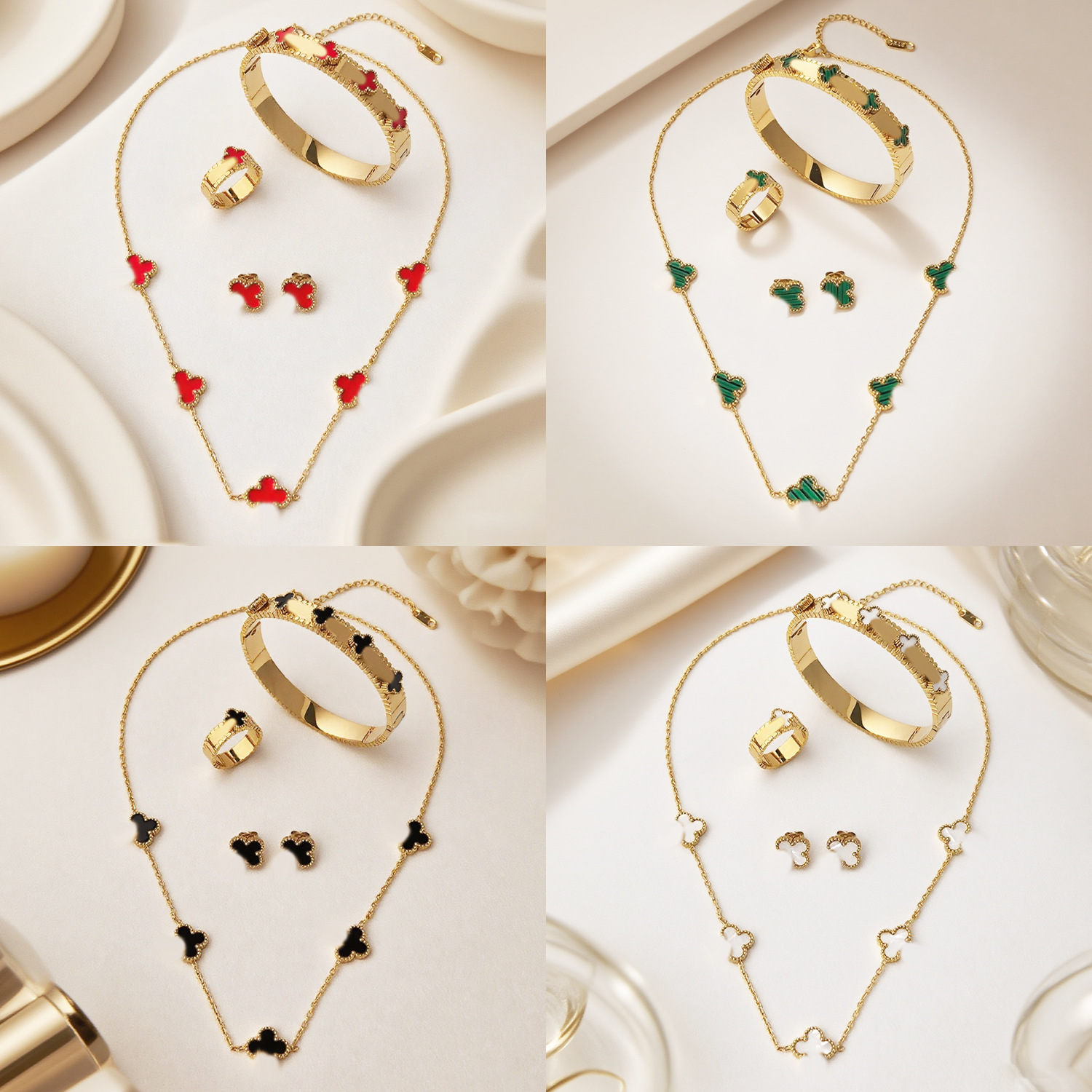 欧美跨境梵家四叶草钛钢手镯项链耳钉戒指套装不掉色手环耳饰项饰