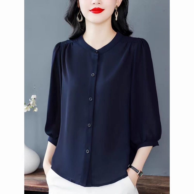高端雪纺衬衣妈妈宽松夏季新款小衫七分袖纯色中袖薄款衬衫上衣女