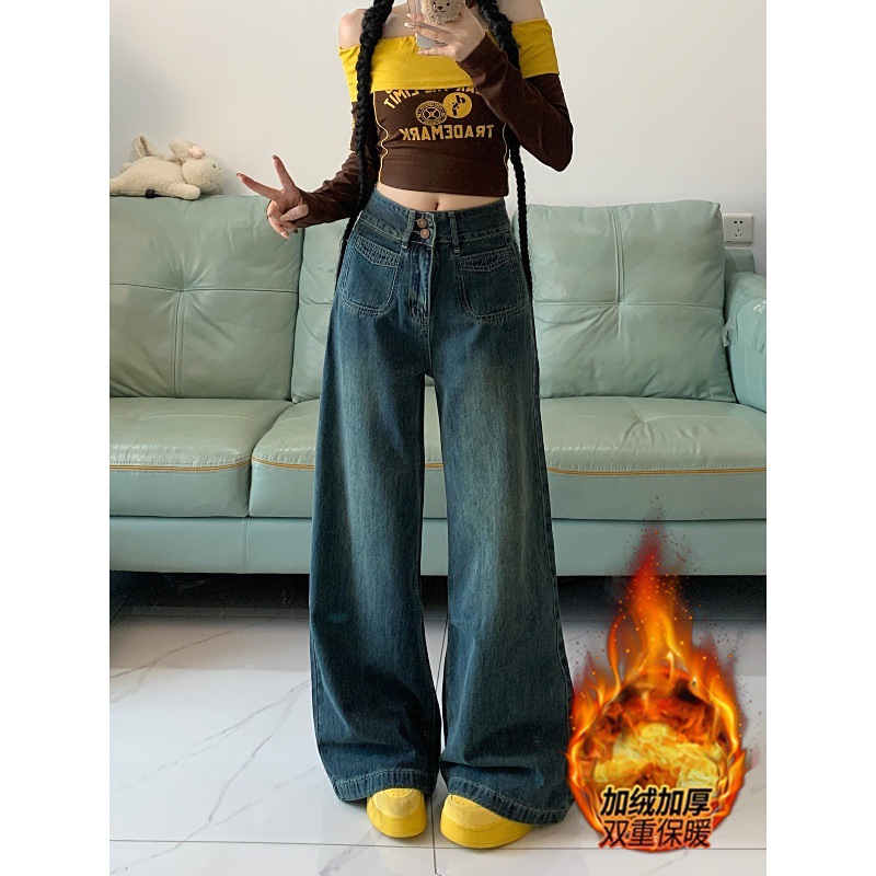 复古水泥灰高腰阔腿牛仔裤女秋冬加绒加厚显瘦大码宽松直筒拖地裤