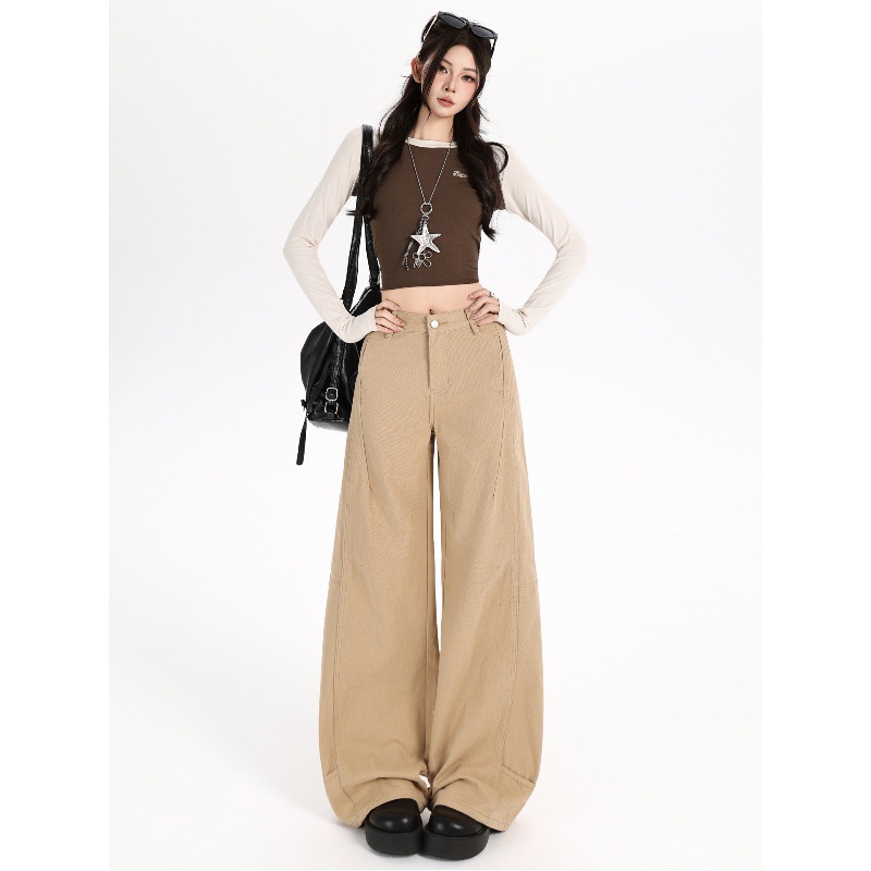 卡其色阔腿牛仔裤女秋季新款大码胖mm宽松梨形身材显瘦垂感直筒裤