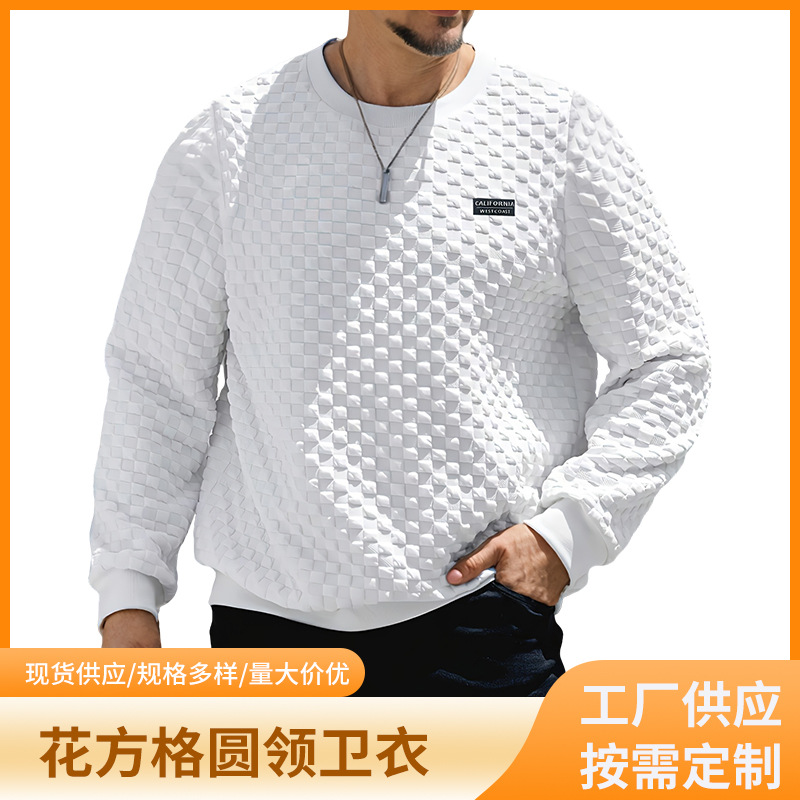 秋季男士提花方格凹凸感长袖卫衣圆领针织衫休闲内搭白色黑色上衣