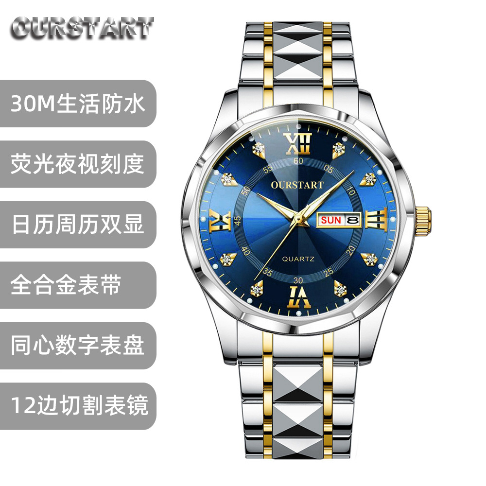 2025新款手表watch男表感跨境夜光防水双日历钢带石英男士手表
