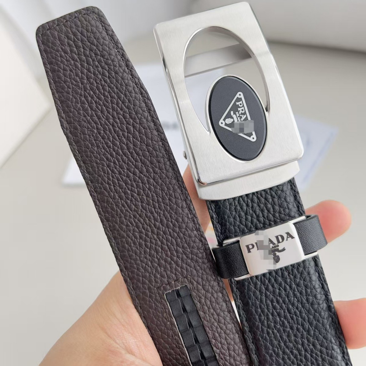 P家三角标腰带皮带头层牛皮真皮双面荔枝纹纯钢自动扣宽度3.5cm