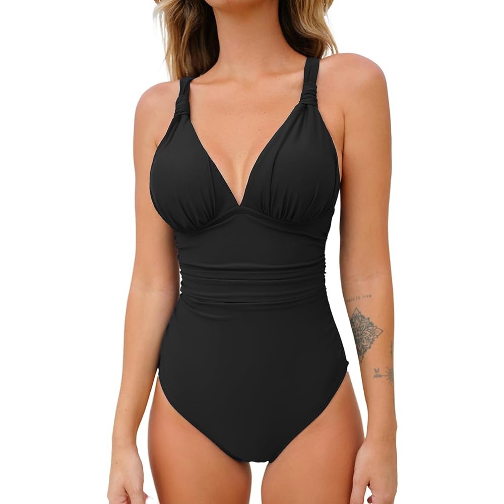 2025欧美新款速卖通连体女 V领露背纯色泳衣女吊带性感泳装
