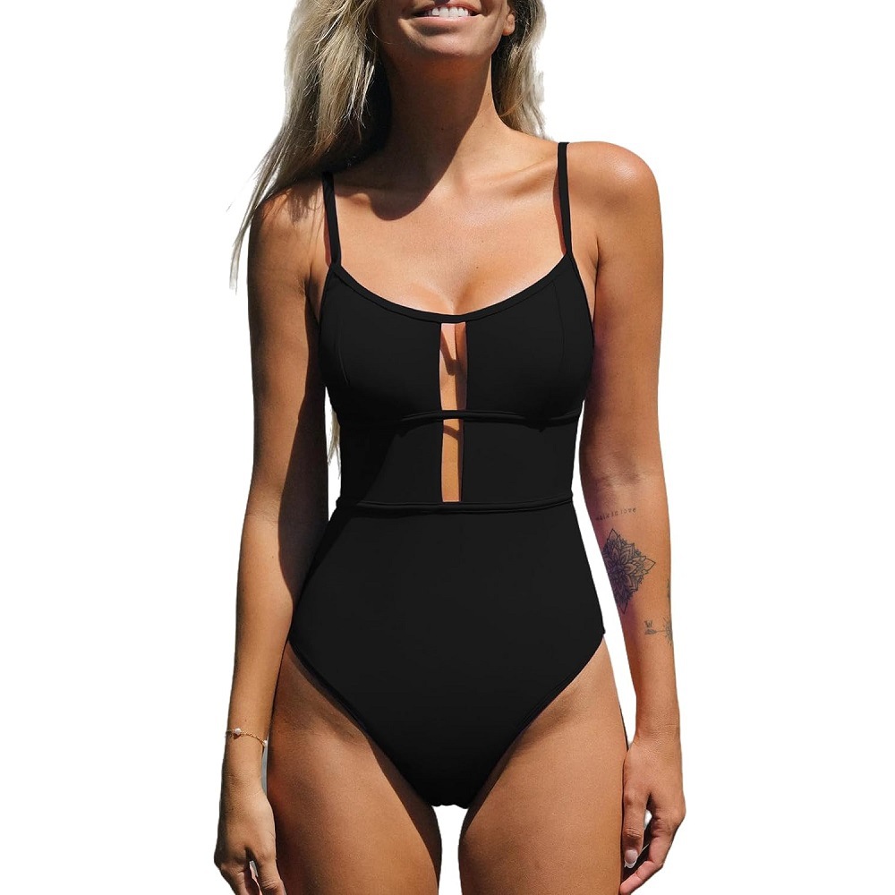 2025速卖通新款泳衣女黑白拼接连体游泳衣纯色时尚性感比基尼泳装