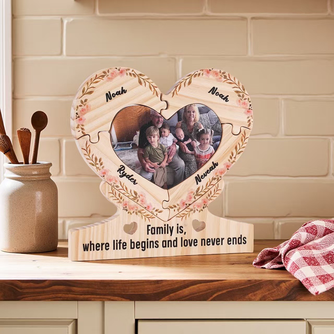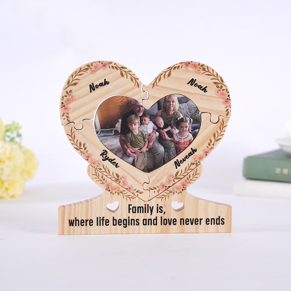 跨境情侣圣诞节定制名字实木质爱心拼图相册照片摆台木制底座木艺