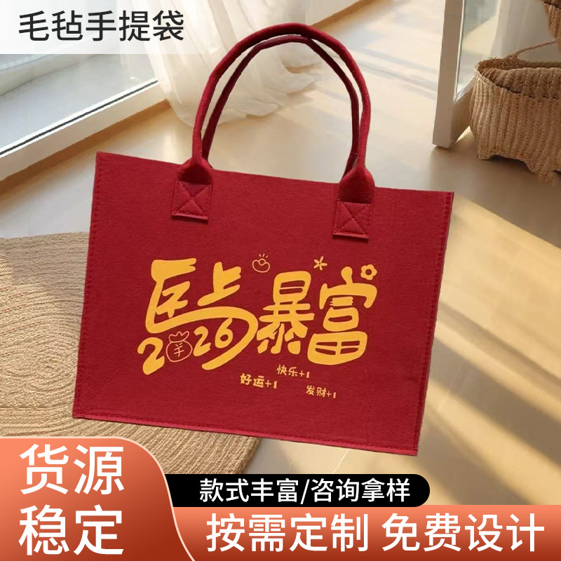 新年红色毛毡手提包马年新款过年回礼毛毡包伴手礼外出收纳包批发